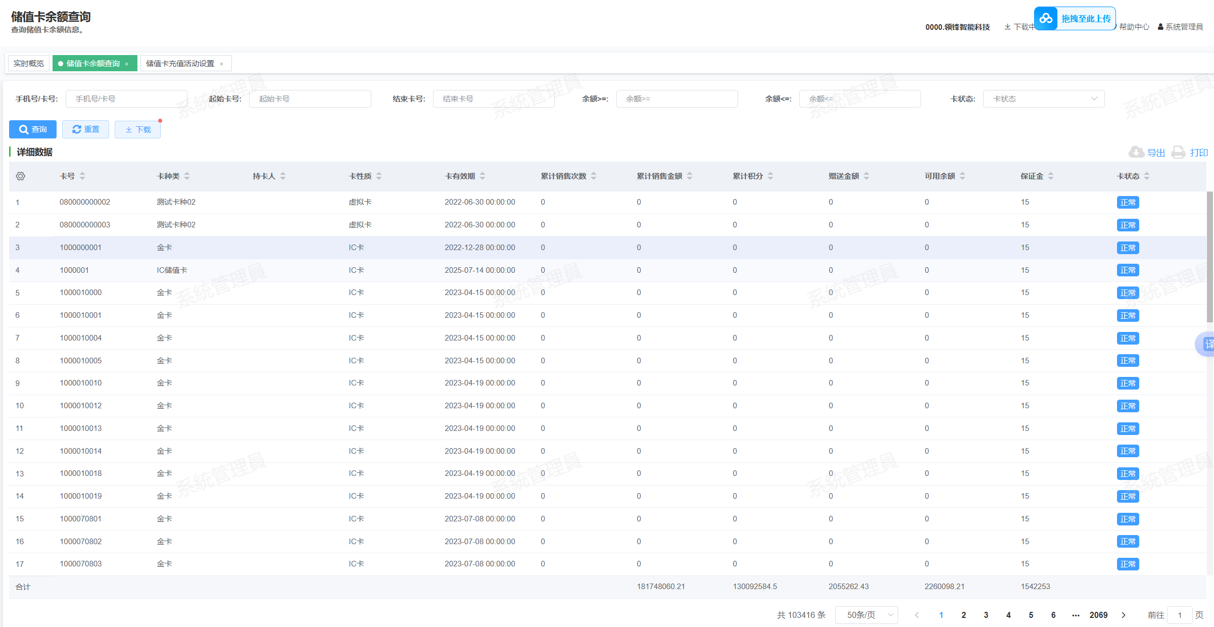 ### 功能说明 查询储值卡余额信息。 ### 操作路径 【储值】→【储值卡余额查询】 ### 操作界面  ### 操作示例 通过功能菜单【储值】→【储值卡余额查询】进入该查询页面,详情如下所示: ### 按钮说明 * 查询:选择好查询条件后,查询所需要的数据 * 重置:查询条件恢复到默认值 * 下载:根据选择的查询条件,将数据下载任务推送到异步下载队列中,待任务拉取数据完成后可在下载中心下载文件