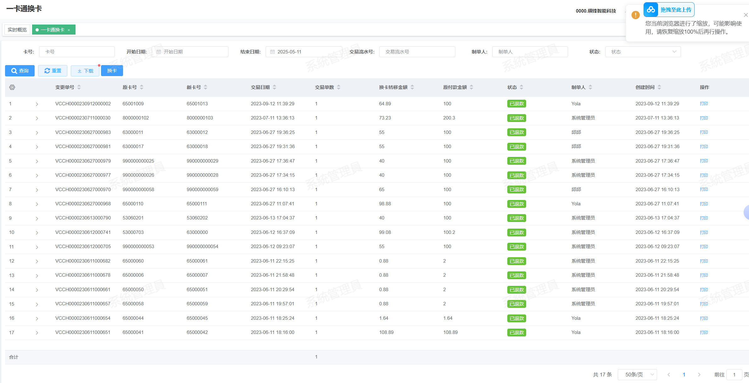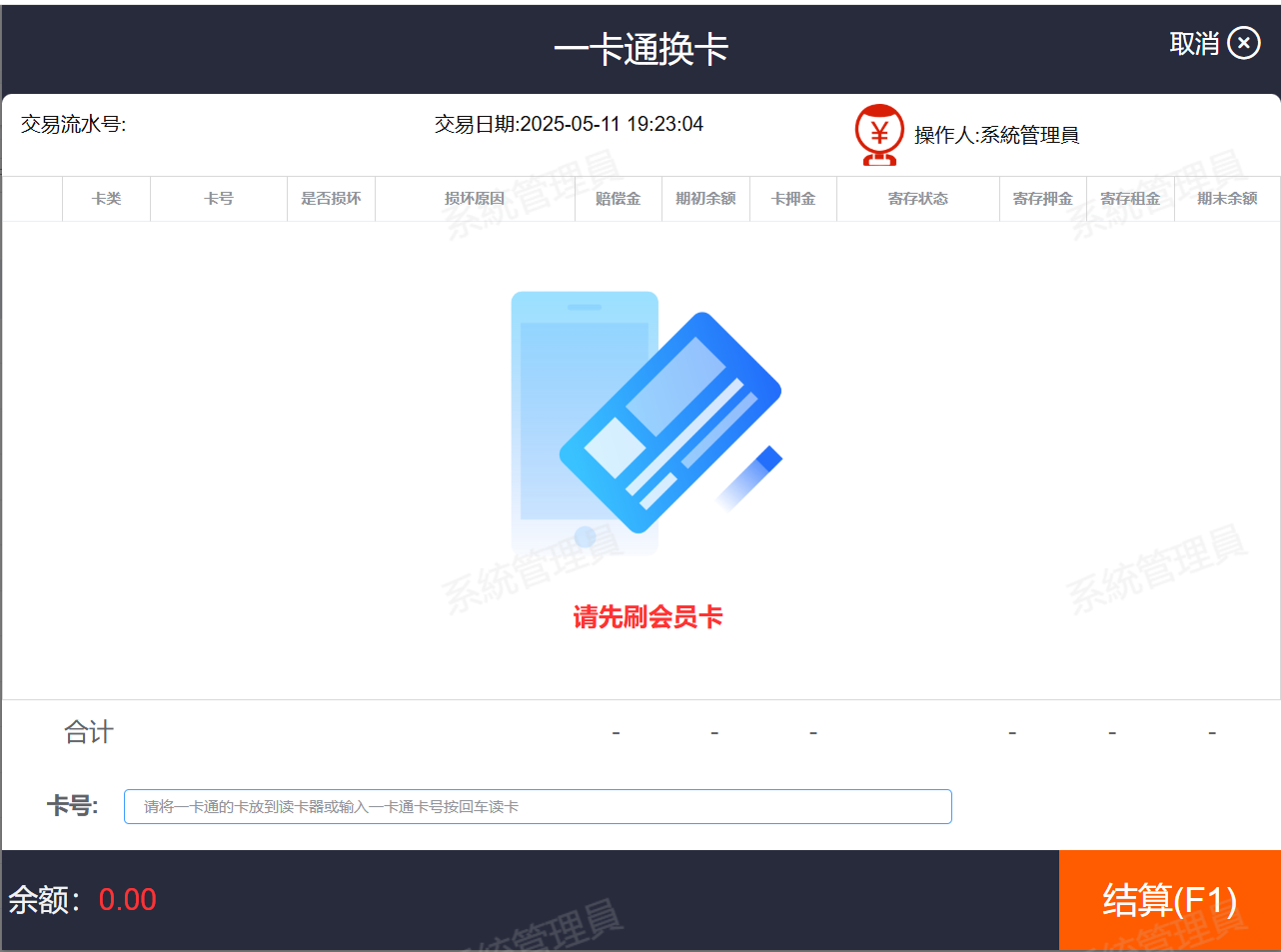 ### 功能说明 对消费异常储值卡进行换卡处理 ### 操作路径 【储值】→【一卡通】→【一卡通换卡】 ### 操作界面  ### 操作示例 通过功能菜单【储值】→【一卡通】→【一卡通换卡】进入一卡通换卡页面,详情如下所示:  ### 按钮说明 * 一卡通换卡:单击该按钮,进行储值卡换卡处理 * 结算:进行支付结算交易 * 查询:单击该按钮,根据录入条件查询数据 ### 注意事项: “交易流水号”是自动生成,不用输入 “支付异常”需点击去支付按钮重新发起支付查询