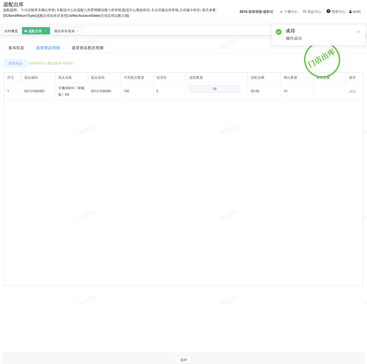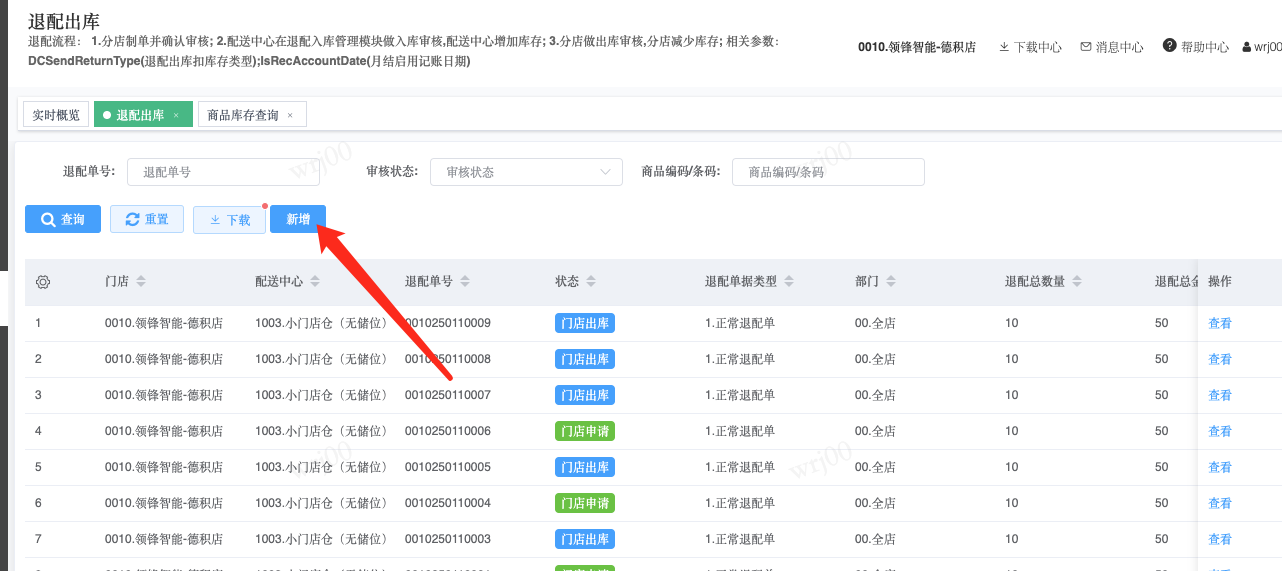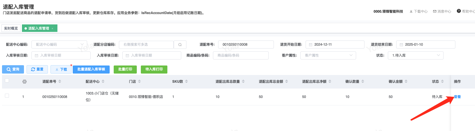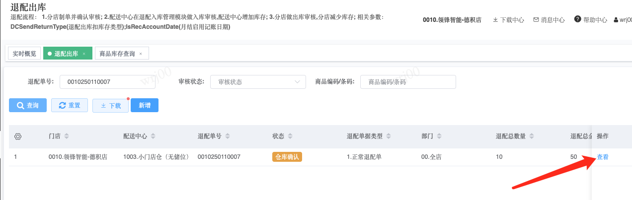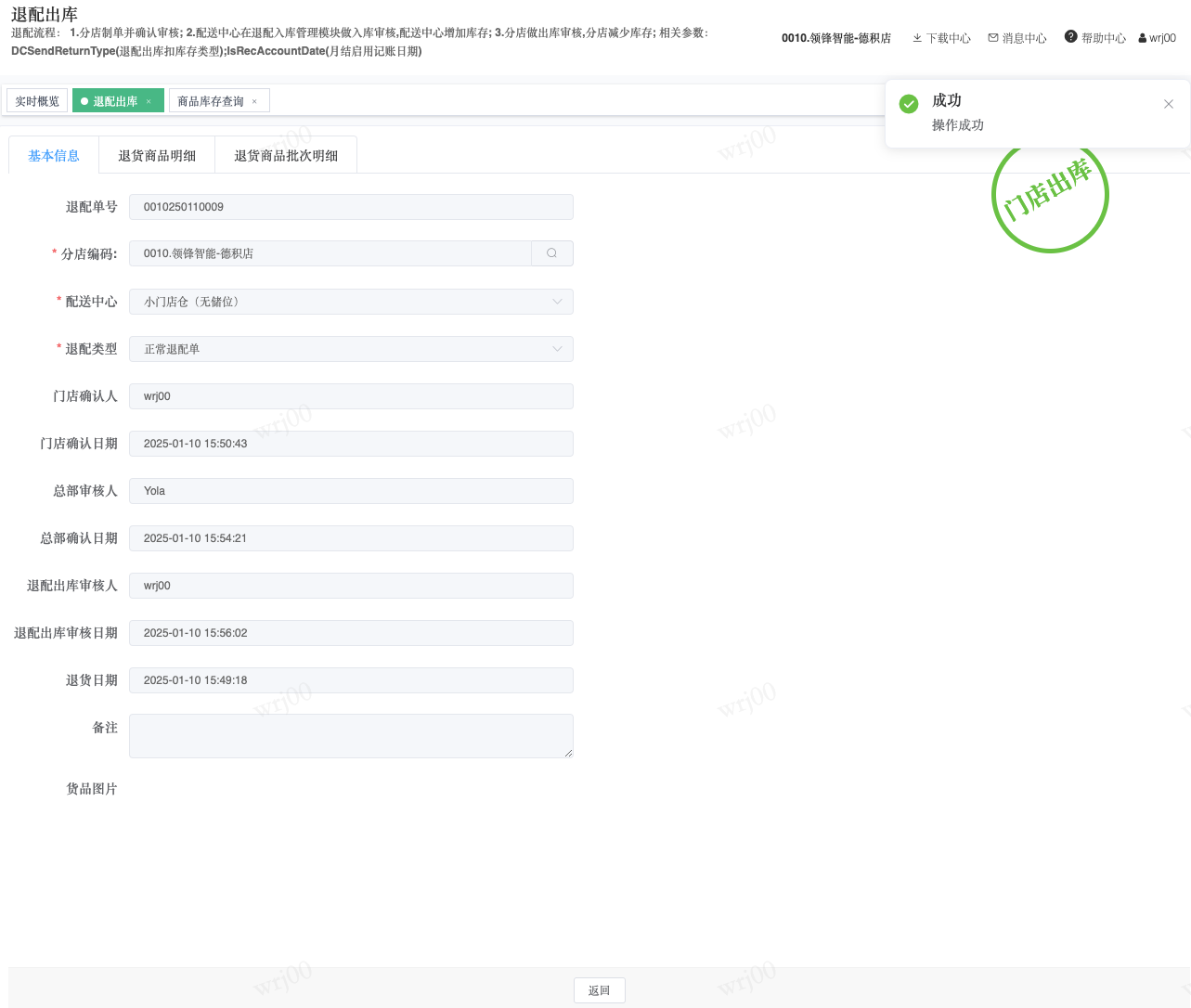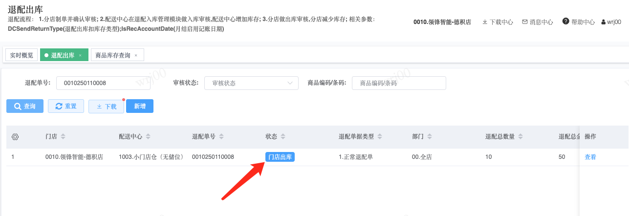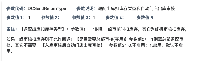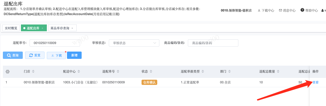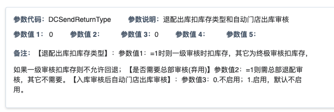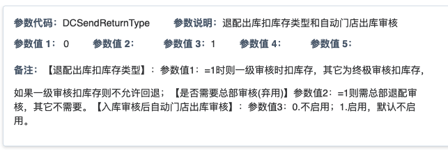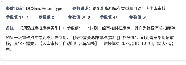 ## 通过参数控制退配流程,可设定门店扣减库存与自动出库审核业务节点 涉及模块:门店/采购/退配出库与总部/配送/退配入库 ### 系统参数:DCSendReturnType.退配出库扣库存类型和自动门店出库审核 【退配出库扣库存类型】:参数值1:=1时则一级审核时扣库存,其它为终极审核扣库存,如果一级审核扣库存则不允许回退;参数值2:=1则需总部退配审核,其它不需要。【入库审核后自动门店出库审核】:参数值3:0.不启用;1.启用,默认不启用。 ### 退配一级审核扣库存不允许回退,不需要总部审核,启用入库审核后自动门店出库审核(参数值1为1,参数值3为1)  * 业务说明:门店新增申请退配出库单,将锁定库存,门店审核后扣减库存;仓库总部登录,查询退配入库单审核后,门店退配出库单自动出库审核,门店退配完成。 * 业务流程: ```mindmap # 门店登录-退配出库 - 新增 - 选择【配送中心、退配类型】 - 【添加商品】选择退配商品 - 填写【退配数量】 - 确认 - 门店锁定库存 - 门店审核 - 门店扣减库存,释放锁定库存 # 总部登录-退配入库 - 查询 - 入库审核 - 仓库增加库存 ``` #### 1、退配前查询库存 * 模块路径:【门店登录】->【库存】->【商品库存查询】 * 查询门店库存  * 模块路径:【总部登录】->【库存】->【商品库存查询(配送)】 * 查询仓库库存  #### 2、新增退配单,确认保存锁定库存,门店审核扣减库存 * 模块路径:【门店登录】->【采购】->【退配出库】       * 模块路径:【门店登录】->【库存】->【商品库存查询】 确认保存退配单锁定库存  * 模块路径:【门店登录】->【库存】->【商品库存查询】 门店审核退配单扣减库存,释放锁定库存  #### 3、仓库审核退配单,入库审核,仓库增加库存 * 模块路径:【总部登录】->【配送】->【退配入库】 * 查询退配单,查看详情,入库审核,退配完成;    #### 4、退配完成查询库存 * 模块路径:【门店登录】->【库存】->【商品库存查询】 * 查询门店库存  * 模块路径:【总部登录】->【库存】->【商品库存查询(配送)】 * 查询仓库库存  ### 退配一级审核扣库存不允许回退,不启用入库审核后自动门店出库审核(参数值1为1,参数值3为0)  * 业务说明:门店新增申请退配出库单,将锁定库存,门店审核后扣减库存;仓库总部登录,查询退配入库单审核后,门店退配出库单不自动;门店查询退配出库单,出库审核后,门店退配完成。 * 业务流程: ```mindmap # 门店登录-退配出库 - 新增 - 选择【配送中心、退配类型】 - 【添加商品】选择退配商品 - 填写【退配数量】 - 确认 - 门店锁定库存 - 门店审核 - 门店扣减库存,释放锁定库存 # 总部登录-退配入库 - 查询 - 入库审核 - 仓库增加库存 # 门店登录-退配出库 - 查询 - 出库审核 ``` #### 1、退配前查询库存 * 模块路径:【门店登录】->【库存】->【商品库存查询】 * 查询门店库存  * 模块路径:【总部登录】->【库存】->【商品库存查询(配送)】 * 查询仓库库存  #### 2、新增退配单,确认保存锁定库存,门店审核扣减库存 * 模块路径:【门店登录】->【采购】->【退配出库】     * 模块路径:【门店登录】->【库存】->【商品库存查询】 门店保存退配单锁定库存  * 模块路径:【门店登录】->【库存】->【商品库存查询】 门店审核退配单扣减库存,释放锁定库存  #### 3、仓库审核退配单 * 模块路径:【总部登录】->【配送】->【退配入库】 * 查询退配单,查看详情,入库审核,仓库增加库存;    #### 4、仓库审核完成查询库存 * 模块路径:【门店登录】->【库存】->【商品库存查询】 * 查询门店库存  * 模块路径:【总部登录】->【库存】->【商品库存查询(配送)】 * 查询仓库库存  #### 5、门店出库审核退配单 * 模块路径:【门店登录】->【采购】->【退配出库】 * 查询退配单,查看详情,出库审核,退配完成。    #### 6、退配完成查询库存 * 模块路径:【门店登录】->【库存】->【商品库存查询】 * 查询门店库存  * 模块路径:【总部登录】->【配送】->【商品库存查询(配送)】 * 查询仓库库存  ### 退配一级审核不扣库存允许回退,不需要总部审核,启用入库审核后自动门店出库审核(参数值1为0,参数值3为1)  * 业务说明:门店新增申请退配出库单,将锁定库存,门店审核后不扣减库存;仓库总部登录,查询退配入库单审核后,门店退配出库单自动出库审核扣减库存,门店退配完成。 * 业务流程: ```mindmap # 门店登录-退配出库 - 新增 - 选择【配送中心、退配类型】 - 【添加商品】选择退配商品 - 填写【退配数量】 - 确认 - 门店锁定库存 - 门店审核 # 总部登录-退配入库 - 查询 - 入库审核 - 门店扣减库存,释放锁定库存 - 仓库增加库存 ``` #### 1、退配前查询库存 * 模块路径:【门店登录】->【库存】->【商品库存查询】 * 查询门店库存  * 模块路径:【总部登录】->【库存】->【商品库存查询(配送)】 * 查询仓库库存  #### 2、新增退配单,确认保存后锁定库存,无误后门店审核 * 模块路径:【门店登录】->【采购】->【退配出库】 * 新增退配单,确认保存;确认无误后门店审核;     * 模块路径:【门店登录】->【库存】->【商品库存查询】  #### 3、仓库审核退配单,仓库增加库存,门店扣减库存,释放锁定库存 * 模块路径:【总部登录】->【配送】->【退配入库】 * 查询退配单,查看详情,入库审核,仓库增加库存,门店扣减库存,释放锁定库存,退配完成;    * 模块路径:【门店登录】->【采购