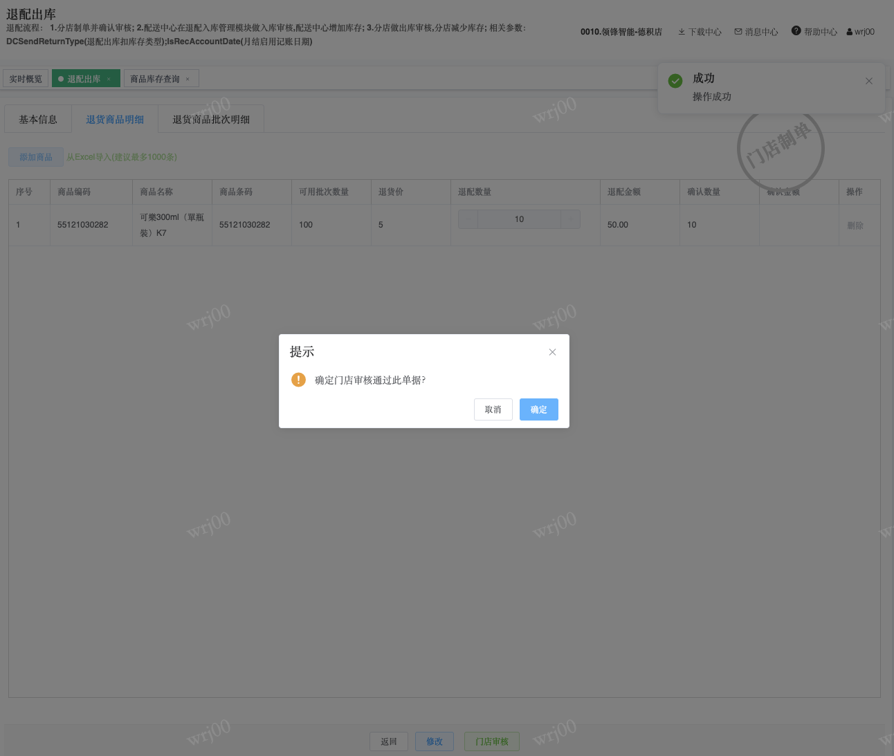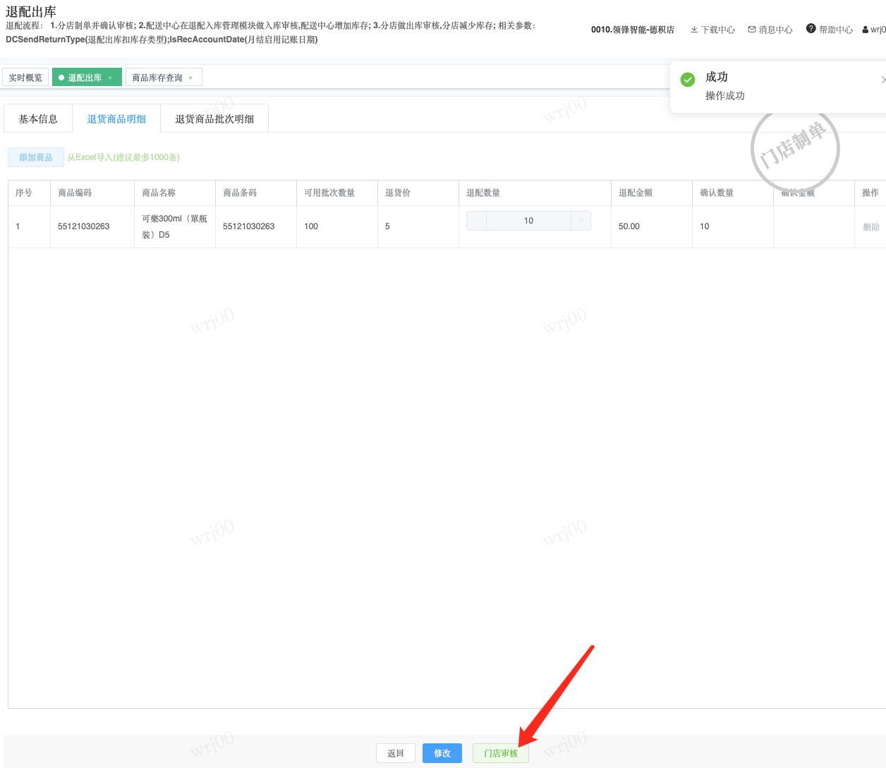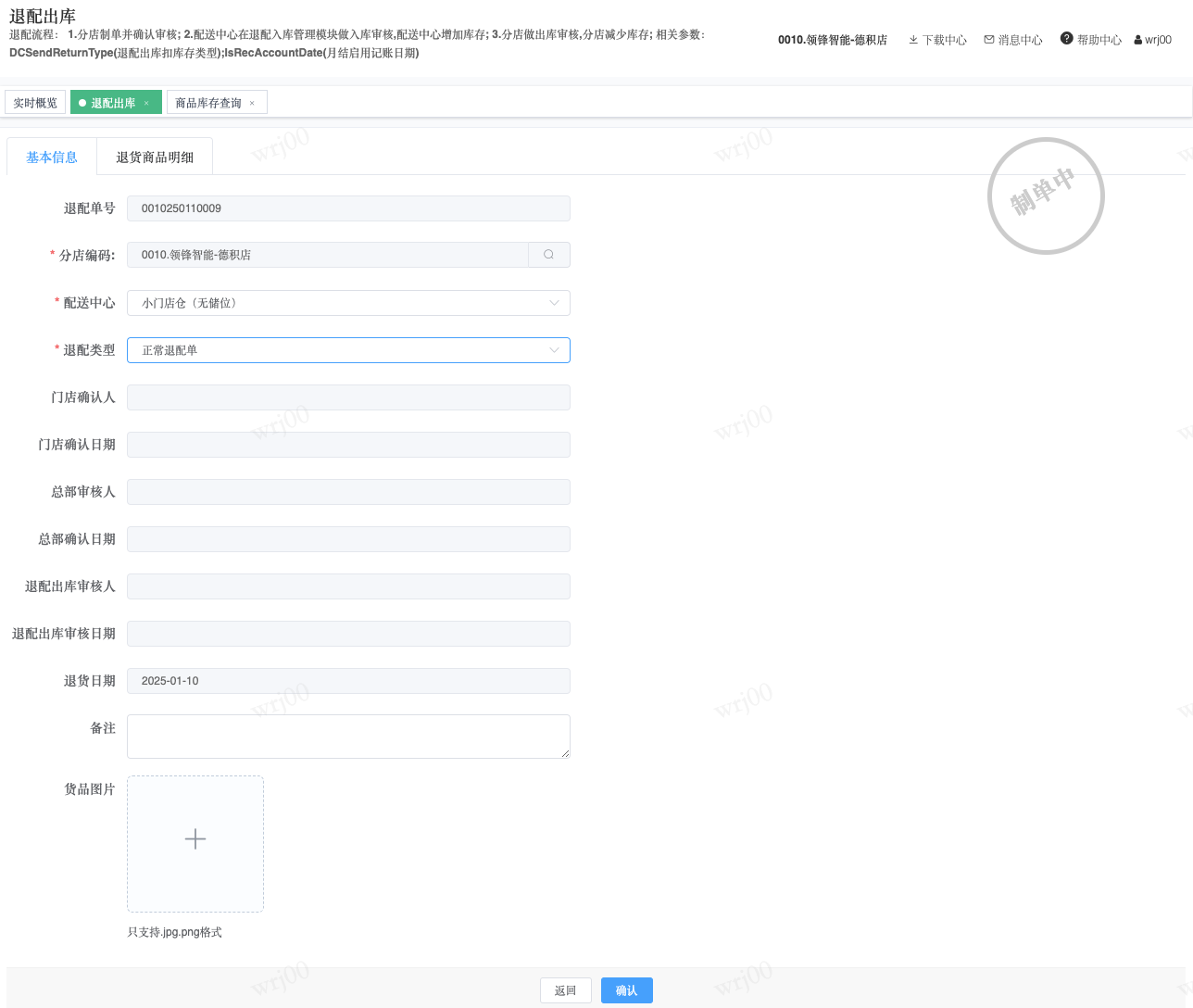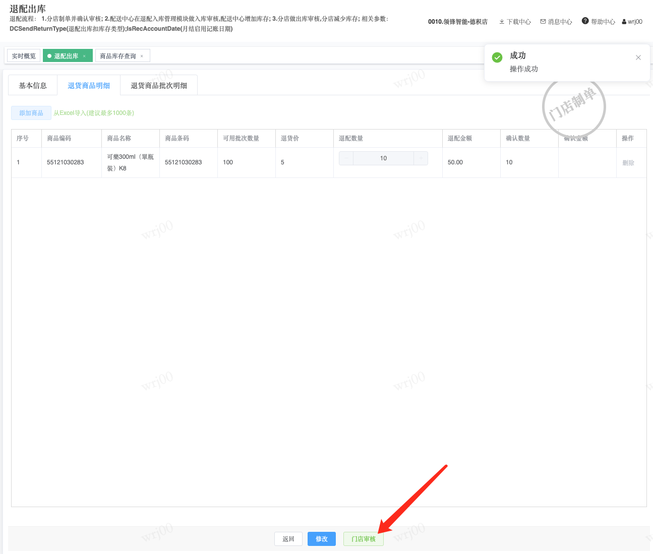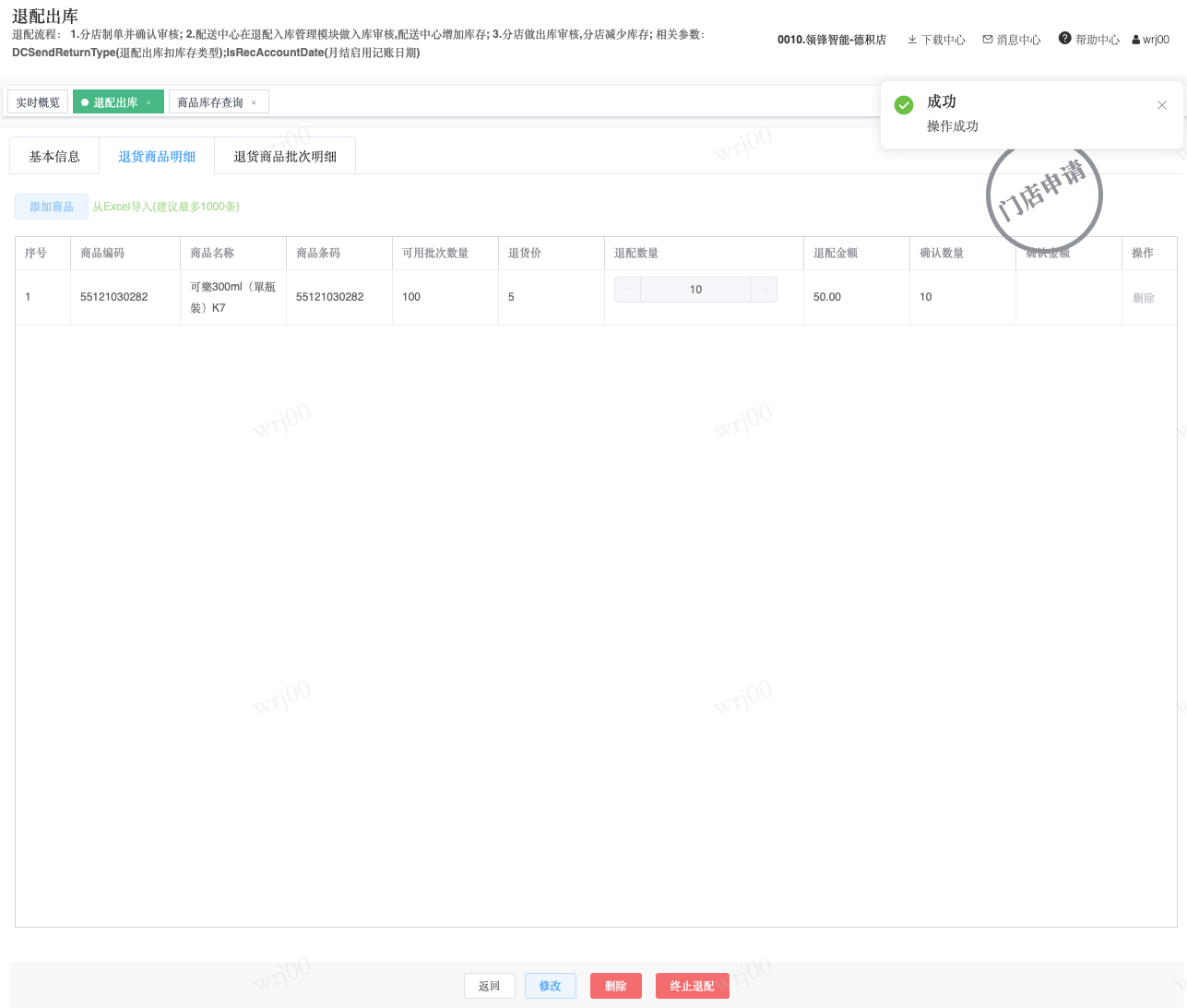 ## 通过参数控制退配流程,可设定门店扣减库存与自动出库审核业务节点 涉及模块:门店/采购/退配出库与总部/配送/退配入库 ### 系统参数:DCSendReturnType.退配出库扣库存类型和自动门店出库审核 【退配出库扣库存类型】:参数值1:=1时则一级审核时扣库存,其它为终极审核扣库存,如果一级审核扣库存则不允许回退;参数值2:=1则需总部退配审核,其它不需要。【入库审核后自动门店出库审核】:参数值3:0.不启用;1.启用,默认不启用。 ### 退配一级审核扣库存不允许回退,不需要总部审核,启用入库审核后自动门店出库审核(参数值1为1,参数值3为1)  * 业务说明:门店新增申请退配出库单,将锁定库存,门店审核后扣减库存;仓库总部登录,查询退配入库单审核后,门店退配出库单自动出库审核,门店退配完成。 * 业务流程: ```mindmap # 门店登录-退配出库 - 新增 - 选择【配送中心、退配类型】 - 【添加商品】选择退配商品 - 填写【退配数量】 - 确认 - 门店锁定库存 - 门店审核 - 门店扣减库存,释放锁定库存 # 总部登录-退配入库 - 查询 - 入库审核 - 仓库增加库存 ``` #### 1、退配前查询库存 * 模块路径:【门店登录】->【库存】->【商品库存查询】 * 查询门店库存  * 模块路径:【总部登录】->【库存】->【商品库存查询(配送)】 * 查询仓库库存  #### 2、新增退配单,确认保存锁定库存,门店审核扣减库存 * 模块路径:【门店登录】->【采购】->【退配出库】       * 模块路径:【门店登录】->【库存】->【商品库存查询】 确认保存退配单锁定库存  * 模块路径:【门店登录】->【库存】->【商品库存查询】 门店审核退配单扣减库存,释放锁定库存  #### 3、仓库审核退配单,入库审核,仓库增加库存 * 模块路径:【总部登录】->【配送】->【退配入库】 * 查询退配单,查看详情,入库审核,退配完成;    #### 4、退配完成查询库存 * 模块路径:【门店登录】->【库存】->【商品库存查询】 * 查询门店库存  * 模块路径:【总部登录】->【库存】->【商品库存查询(配送)】 * 查询仓库库存  ### 退配一级审核扣库存不允许回退,不启用入库审核后自动门店出库审核(参数值1为1,参数值3为0)  * 业务说明:门店新增申请退配出库单,将锁定库存,门店审核后扣减库存;仓库总部登录,查询退配入库单审核后,门店退配出库单不自动;门店查询退配出库单,出库审核后,门店退配完成。 * 业务流程: ```mindmap # 门店登录-退配出库 - 新增 - 选择【配送中心、退配类型】 - 【添加商品】选择退配商品 - 填写【退配数量】 - 确认 - 门店锁定库存 - 门店审核 - 门店扣减库存,释放锁定库存 # 总部登录-退配入库 - 查询 - 入库审核 - 仓库增加库存 # 门店登录-退配出库 - 查询 - 出库审核 ``` #### 1、退配前查询库存 * 模块路径:【门店登录】->【库存】->【商品库存查询】 * 查询门店库存  * 模块路径:【总部登录】->【库存】->【商品库存查询(配送)】 * 查询仓库库存  #### 2、新增退配单,确认保存锁定库存,门店审核扣减库存 * 模块路径:【门店登录】->【采购】->【退配出库】     * 模块路径:【门店登录】->【库存】->【商品库存查询】 门店保存退配单锁定库存  * 模块路径:【门店登录】->【库存】->【商品库存查询】 门店审核退配单扣减库存,释放锁定库存  #### 3、仓库审核退配单 * 模块路径:【总部登录】->【配送】->【退配入库】 * 查询退配单,查看详情,入库审核,仓库增加库存;    #### 4、仓库审核完成查询库存 * 模块路径:【门店登录】->【库存】->【商品库存查询】 * 查询门店库存  * 模块路径:【总部登录】->【库存】->【商品库存查询(配送)】 * 查询仓库库存  #### 5、门店出库审核退配单 * 模块路径:【门店登录】->【采购】->【退配出库】 * 查询退配单,查看详情,出库审核,退配完成。    #### 6、退配完成查询库存 * 模块路径:【门店登录】->【库存】->【商品库存查询】 * 查询门店库存  * 模块路径:【总部登录】->【配送】->【商品库存查询(配送)】 * 查询仓库库存  ### 退配一级审核不扣库存允许回退,不需要总部审核,启用入库审核后自动门店出库审核(参数值1为0,参数值3为1)  * 业务说明:门店新增申请退配出库单,将锁定库存,门店审核后不扣减库存;仓库总部登录,查询退配入库单审核后,门店退配出库单自动出库审核扣减库存,门店退配完成。 * 业务流程: ```mindmap # 门店登录-退配出库 - 新增 - 选择【配送中心、退配类型】 - 【添加商品】选择退配商品 - 填写【退配数量】 - 确认 - 门店锁定库存 - 门店审核 # 总部登录-退配入库 - 查询 - 入库审核 - 门店扣减库存,释放锁定库存 - 仓库增加库存 ``` #### 1、退配前查询库存 * 模块路径:【门店登录】->【库存】->【商品库存查询】 * 查询门店库存  * 模块路径:【总部登录】->【库存】->【商品库存查询(配送)】 * 查询仓库库存  #### 2、新增退配单,确认保存后锁定库存,无误后门店审核 * 模块路径:【门店登录】->【采购】->【退配出库】 * 新增退配单,确认保存;确认无误后门店审核;     * 模块路径:【门店登录】->【库存】->【商品库存查询】  #### 3、仓库审核退配单,仓库增加库存,门店扣减库存,释放锁定库存 * 模块路径:【总部登录】->【配送】->【退配入库】 * 查询退配单,查看详情,入库审核,仓库增加库存,门店扣减库存,释放锁定库存,退配完成;    * 模块路径:【门店登录】->【采购