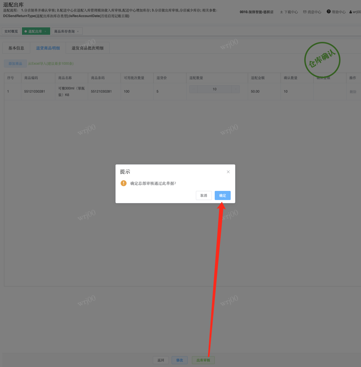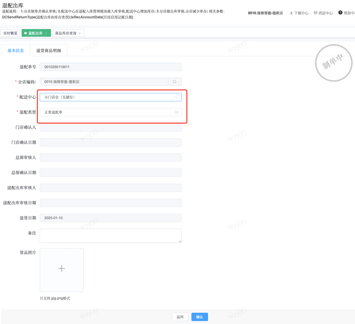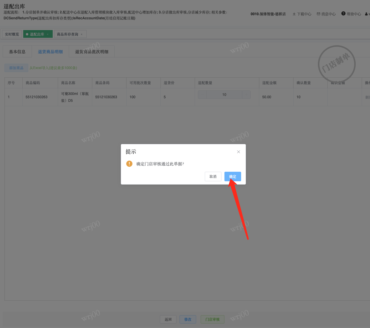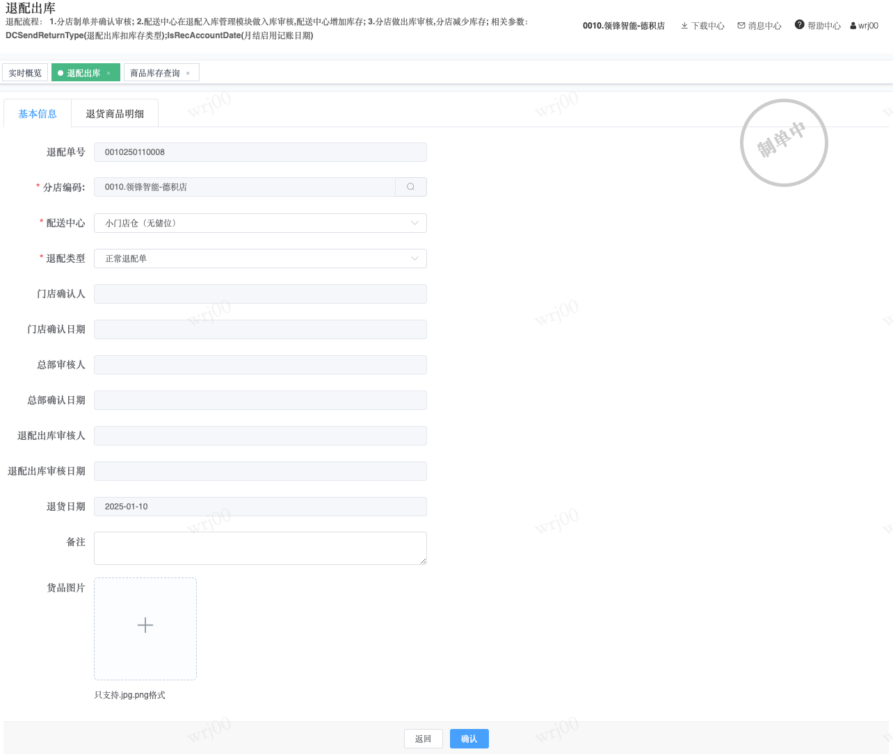 ## 通过参数控制退配流程,可设定门店扣减库存与自动出库审核业务节点 涉及模块:门店/采购/退配出库与总部/配送/退配入库 ### 系统参数:DCSendReturnType.退配出库扣库存类型和自动门店出库审核 【退配出库扣库存类型】:参数值1:=1时则一级审核时扣库存,其它为终极审核扣库存,如果一级审核扣库存则不允许回退;参数值2:=1则需总部退配审核,其它不需要。【入库审核后自动门店出库审核】:参数值3:0.不启用;1.启用,默认不启用。 ### 退配一级审核扣库存不允许回退,不需要总部审核,启用入库审核后自动门店出库审核(参数值1为1,参数值3为1)  * 业务说明:门店新增申请退配出库单,将锁定库存,门店审核后扣减库存;仓库总部登录,查询退配入库单审核后,门店退配出库单自动出库审核,门店退配完成。 * 业务流程: ```mindmap # 门店登录-退配出库 - 新增 - 选择【配送中心、退配类型】 - 【添加商品】选择退配商品 - 填写【退配数量】 - 确认 - 门店锁定库存 - 门店审核 - 门店扣减库存,释放锁定库存 # 总部登录-退配入库 - 查询 - 入库审核 - 仓库增加库存 ``` #### 1、退配前查询库存 * 模块路径:【门店登录】->【库存】->【商品库存查询】 * 查询门店库存  * 模块路径:【总部登录】->【库存】->【商品库存查询(配送)】 * 查询仓库库存  #### 2、新增退配单,确认保存锁定库存,门店审核扣减库存 * 模块路径:【门店登录】->【采购】->【退配出库】       * 模块路径:【门店登录】->【库存】->【商品库存查询】 确认保存退配单锁定库存  * 模块路径:【门店登录】->【库存】->【商品库存查询】 门店审核退配单扣减库存,释放锁定库存  #### 3、仓库审核退配单,入库审核,仓库增加库存 * 模块路径:【总部登录】->【配送】->【退配入库】 * 查询退配单,查看详情,入库审核,退配完成;    #### 4、退配完成查询库存 * 模块路径:【门店登录】->【库存】->【商品库存查询】 * 查询门店库存  * 模块路径:【总部登录】->【库存】->【商品库存查询(配送)】 * 查询仓库库存  ### 退配一级审核扣库存不允许回退,不启用入库审核后自动门店出库审核(参数值1为1,参数值3为0)  * 业务说明:门店新增申请退配出库单,将锁定库存,门店审核后扣减库存;仓库总部登录,查询退配入库单审核后,门店退配出库单不自动;门店查询退配出库单,出库审核后,门店退配完成。 * 业务流程: ```mindmap # 门店登录-退配出库 - 新增 - 选择【配送中心、退配类型】 - 【添加商品】选择退配商品 - 填写【退配数量】 - 确认 - 门店锁定库存 - 门店审核 - 门店扣减库存,释放锁定库存 # 总部登录-退配入库 - 查询 - 入库审核 - 仓库增加库存 # 门店登录-退配出库 - 查询 - 出库审核 ``` #### 1、退配前查询库存 * 模块路径:【门店登录】->【库存】->【商品库存查询】 * 查询门店库存  * 模块路径:【总部登录】->【库存】->【商品库存查询(配送)】 * 查询仓库库存  #### 2、新增退配单,确认保存锁定库存,门店审核扣减库存 * 模块路径:【门店登录】->【采购】->【退配出库】     * 模块路径:【门店登录】->【库存】->【商品库存查询】 门店保存退配单锁定库存  * 模块路径:【门店登录】->【库存】->【商品库存查询】 门店审核退配单扣减库存,释放锁定库存  #### 3、仓库审核退配单 * 模块路径:【总部登录】->【配送】->【退配入库】 * 查询退配单,查看详情,入库审核,仓库增加库存;    #### 4、仓库审核完成查询库存 * 模块路径:【门店登录】->【库存】->【商品库存查询】 * 查询门店库存  * 模块路径:【总部登录】->【库存】->【商品库存查询(配送)】 * 查询仓库库存  #### 5、门店出库审核退配单 * 模块路径:【门店登录】->【采购】->【退配出库】 * 查询退配单,查看详情,出库审核,退配完成。    #### 6、退配完成查询库存 * 模块路径:【门店登录】->【库存】->【商品库存查询】 * 查询门店库存  * 模块路径:【总部登录】->【配送】->【商品库存查询(配送)】 * 查询仓库库存  ### 退配一级审核不扣库存允许回退,不需要总部审核,启用入库审核后自动门店出库审核(参数值1为0,参数值3为1)  * 业务说明:门店新增申请退配出库单,将锁定库存,门店审核后不扣减库存;仓库总部登录,查询退配入库单审核后,门店退配出库单自动出库审核扣减库存,门店退配完成。 * 业务流程: ```mindmap # 门店登录-退配出库 - 新增 - 选择【配送中心、退配类型】 - 【添加商品】选择退配商品 - 填写【退配数量】 - 确认 - 门店锁定库存 - 门店审核 # 总部登录-退配入库 - 查询 - 入库审核 - 门店扣减库存,释放锁定库存 - 仓库增加库存 ``` #### 1、退配前查询库存 * 模块路径:【门店登录】->【库存】->【商品库存查询】 * 查询门店库存  * 模块路径:【总部登录】->【库存】->【商品库存查询(配送)】 * 查询仓库库存  #### 2、新增退配单,确认保存后锁定库存,无误后门店审核 * 模块路径:【门店登录】->【采购】->【退配出库】 * 新增退配单,确认保存;确认无误后门店审核;     * 模块路径:【门店登录】->【库存】->【商品库存查询】  #### 3、仓库审核退配单,仓库增加库存,门店扣减库存,释放锁定库存 * 模块路径:【总部登录】->【配送】->【退配入库】 * 查询退配单,查看详情,入库审核,仓库增加库存,门店扣减库存,释放锁定库存,退配完成;    * 模块路径:【门店登录】->【采购
