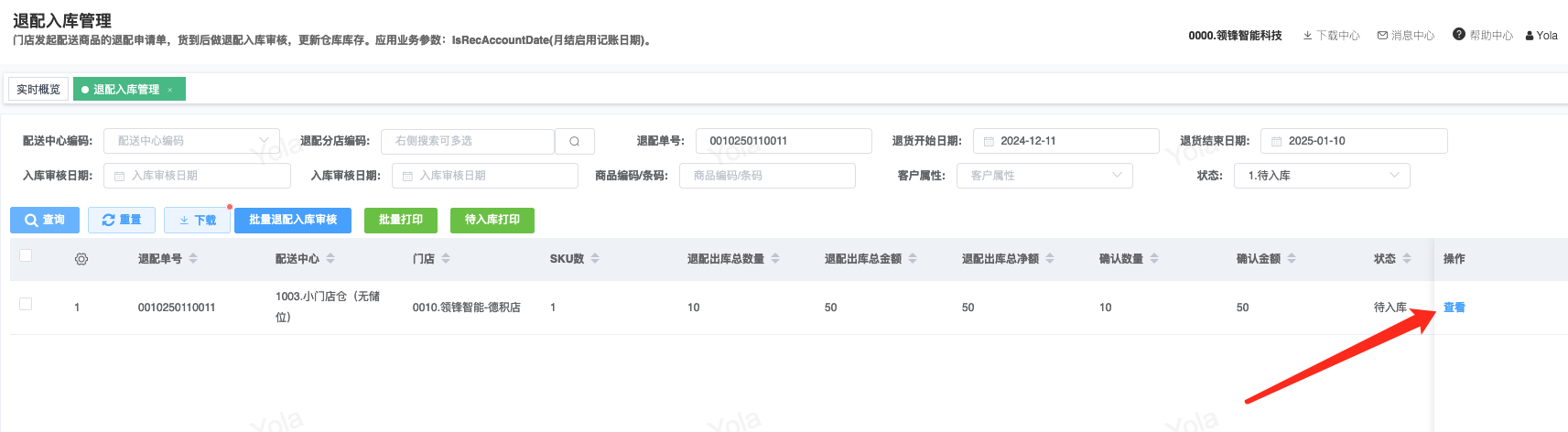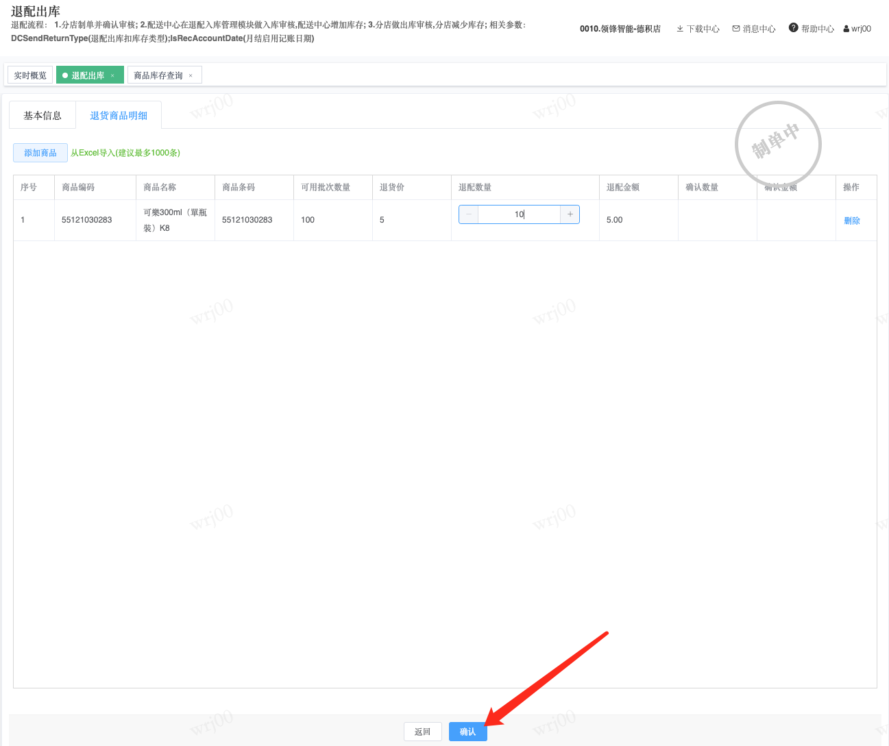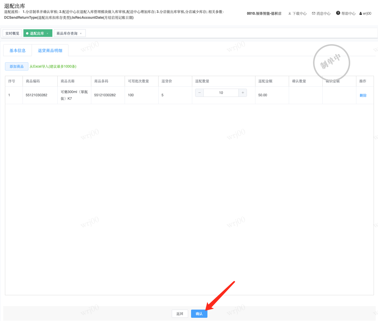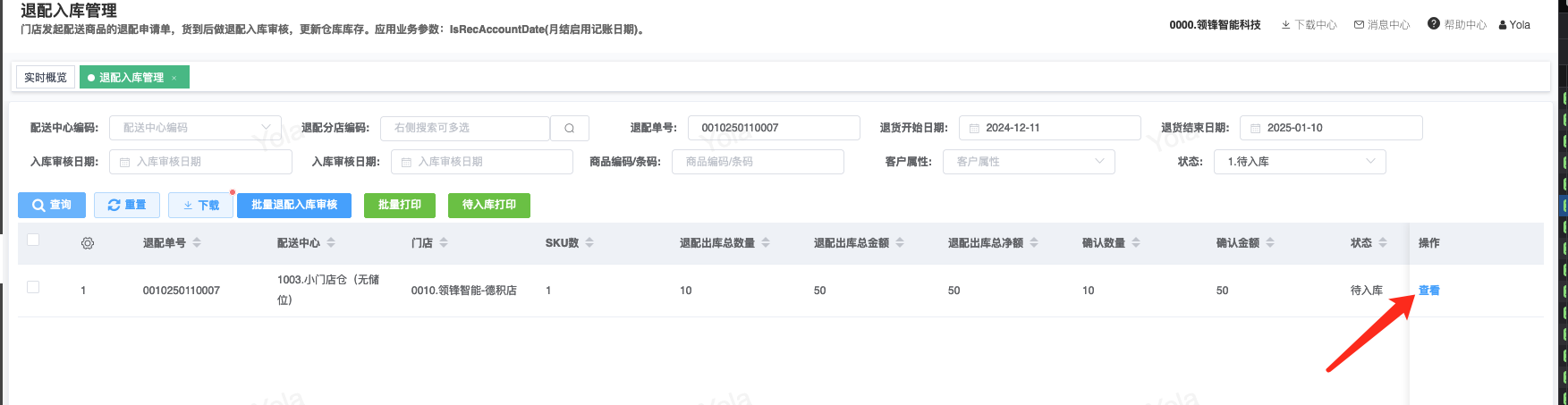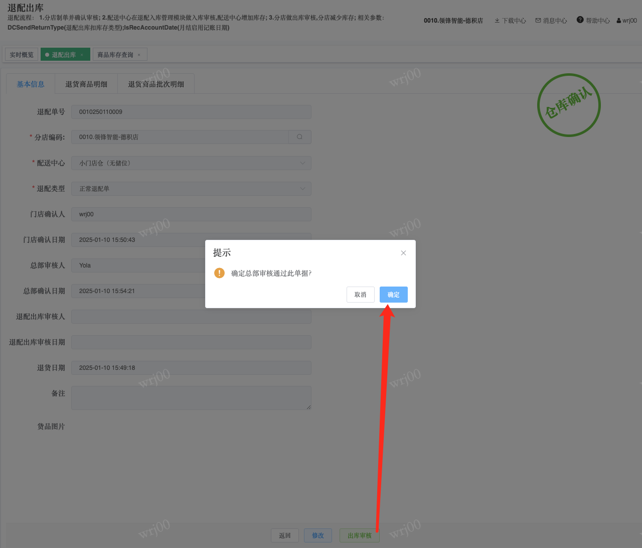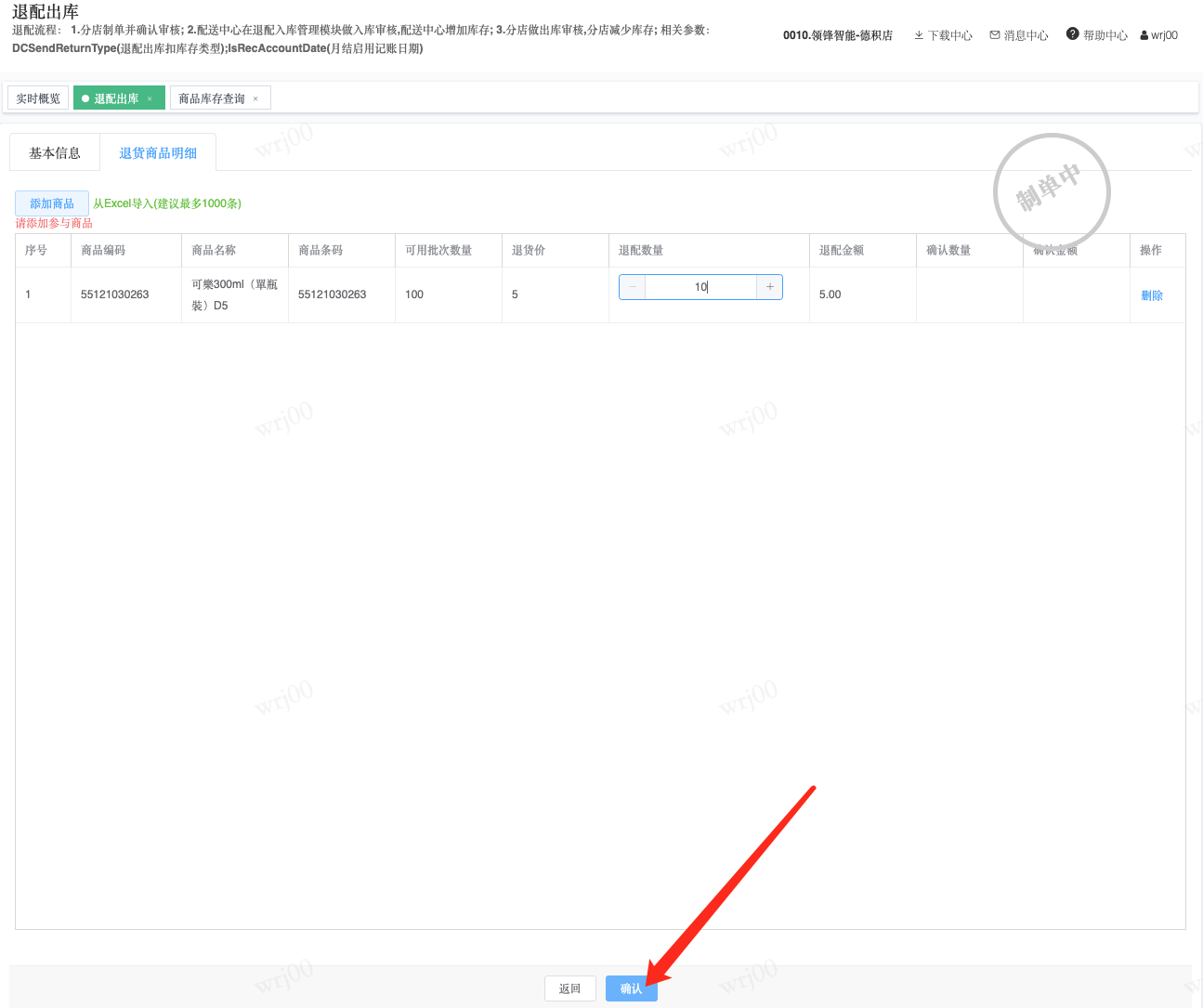 ## 通过参数控制退配流程,可设定门店扣减库存与自动出库审核业务节点 涉及模块:门店/采购/退配出库与总部/配送/退配入库 ### 系统参数:DCSendReturnType.退配出库扣库存类型和自动门店出库审核 【退配出库扣库存类型】:参数值1:=1时则一级审核时扣库存,其它为终极审核扣库存,如果一级审核扣库存则不允许回退;参数值2:=1则需总部退配审核,其它不需要。【入库审核后自动门店出库审核】:参数值3:0.不启用;1.启用,默认不启用。 ### 退配一级审核扣库存不允许回退,不需要总部审核,启用入库审核后自动门店出库审核(参数值1为1,参数值3为1)  * 业务说明:门店新增申请退配出库单,将锁定库存,门店审核后扣减库存;仓库总部登录,查询退配入库单审核后,门店退配出库单自动出库审核,门店退配完成。 * 业务流程: ```mindmap # 门店登录-退配出库 - 新增 - 选择【配送中心、退配类型】 - 【添加商品】选择退配商品 - 填写【退配数量】 - 确认 - 门店锁定库存 - 门店审核 - 门店扣减库存,释放锁定库存 # 总部登录-退配入库 - 查询 - 入库审核 - 仓库增加库存 ``` #### 1、退配前查询库存 * 模块路径:【门店登录】->【库存】->【商品库存查询】 * 查询门店库存  * 模块路径:【总部登录】->【库存】->【商品库存查询(配送)】 * 查询仓库库存  #### 2、新增退配单,确认保存锁定库存,门店审核扣减库存 * 模块路径:【门店登录】->【采购】->【退配出库】       * 模块路径:【门店登录】->【库存】->【商品库存查询】 确认保存退配单锁定库存  * 模块路径:【门店登录】->【库存】->【商品库存查询】 门店审核退配单扣减库存,释放锁定库存  #### 3、仓库审核退配单,入库审核,仓库增加库存 * 模块路径:【总部登录】->【配送】->【退配入库】 * 查询退配单,查看详情,入库审核,退配完成;    #### 4、退配完成查询库存 * 模块路径:【门店登录】->【库存】->【商品库存查询】 * 查询门店库存  * 模块路径:【总部登录】->【库存】->【商品库存查询(配送)】 * 查询仓库库存  ### 退配一级审核扣库存不允许回退,不启用入库审核后自动门店出库审核(参数值1为1,参数值3为0)  * 业务说明:门店新增申请退配出库单,将锁定库存,门店审核后扣减库存;仓库总部登录,查询退配入库单审核后,门店退配出库单不自动;门店查询退配出库单,出库审核后,门店退配完成。 * 业务流程: ```mindmap # 门店登录-退配出库 - 新增 - 选择【配送中心、退配类型】 - 【添加商品】选择退配商品 - 填写【退配数量】 - 确认 - 门店锁定库存 - 门店审核 - 门店扣减库存,释放锁定库存 # 总部登录-退配入库 - 查询 - 入库审核 - 仓库增加库存 # 门店登录-退配出库 - 查询 - 出库审核 ``` #### 1、退配前查询库存 * 模块路径:【门店登录】->【库存】->【商品库存查询】 * 查询门店库存  * 模块路径:【总部登录】->【库存】->【商品库存查询(配送)】 * 查询仓库库存  #### 2、新增退配单,确认保存锁定库存,门店审核扣减库存 * 模块路径:【门店登录】->【采购】->【退配出库】     * 模块路径:【门店登录】->【库存】->【商品库存查询】 门店保存退配单锁定库存  * 模块路径:【门店登录】->【库存】->【商品库存查询】 门店审核退配单扣减库存,释放锁定库存  #### 3、仓库审核退配单 * 模块路径:【总部登录】->【配送】->【退配入库】 * 查询退配单,查看详情,入库审核,仓库增加库存;    #### 4、仓库审核完成查询库存 * 模块路径:【门店登录】->【库存】->【商品库存查询】 * 查询门店库存  * 模块路径:【总部登录】->【库存】->【商品库存查询(配送)】 * 查询仓库库存  #### 5、门店出库审核退配单 * 模块路径:【门店登录】->【采购】->【退配出库】 * 查询退配单,查看详情,出库审核,退配完成。    #### 6、退配完成查询库存 * 模块路径:【门店登录】->【库存】->【商品库存查询】 * 查询门店库存  * 模块路径:【总部登录】->【配送】->【商品库存查询(配送)】 * 查询仓库库存  ### 退配一级审核不扣库存允许回退,不需要总部审核,启用入库审核后自动门店出库审核(参数值1为0,参数值3为1)  * 业务说明:门店新增申请退配出库单,将锁定库存,门店审核后不扣减库存;仓库总部登录,查询退配入库单审核后,门店退配出库单自动出库审核扣减库存,门店退配完成。 * 业务流程: ```mindmap # 门店登录-退配出库 - 新增 - 选择【配送中心、退配类型】 - 【添加商品】选择退配商品 - 填写【退配数量】 - 确认 - 门店锁定库存 - 门店审核 # 总部登录-退配入库 - 查询 - 入库审核 - 门店扣减库存,释放锁定库存 - 仓库增加库存 ``` #### 1、退配前查询库存 * 模块路径:【门店登录】->【库存】->【商品库存查询】 * 查询门店库存  * 模块路径:【总部登录】->【库存】->【商品库存查询(配送)】 * 查询仓库库存  #### 2、新增退配单,确认保存后锁定库存,无误后门店审核 * 模块路径:【门店登录】->【采购】->【退配出库】 * 新增退配单,确认保存;确认无误后门店审核;     * 模块路径:【门店登录】->【库存】->【商品库存查询】  #### 3、仓库审核退配单,仓库增加库存,门店扣减库存,释放锁定库存 * 模块路径:【总部登录】->【配送】->【退配入库】 * 查询退配单,查看详情,入库审核,仓库增加库存,门店扣减库存,释放锁定库存,退配完成;    * 模块路径:【门店登录】->【采购