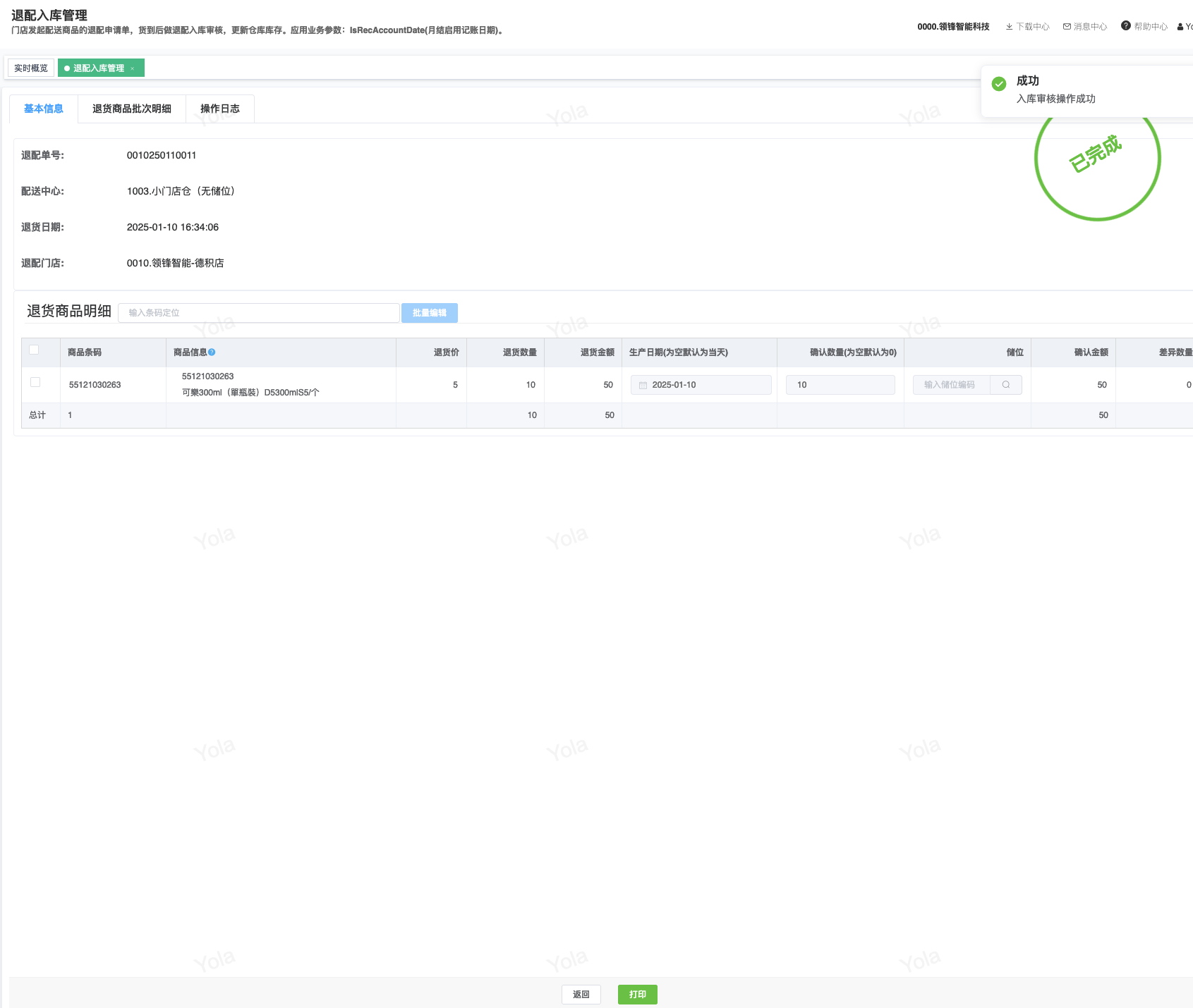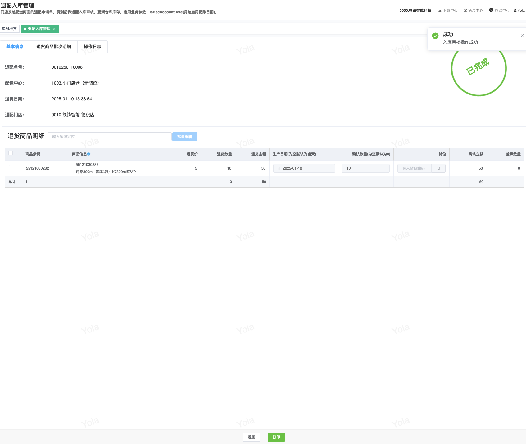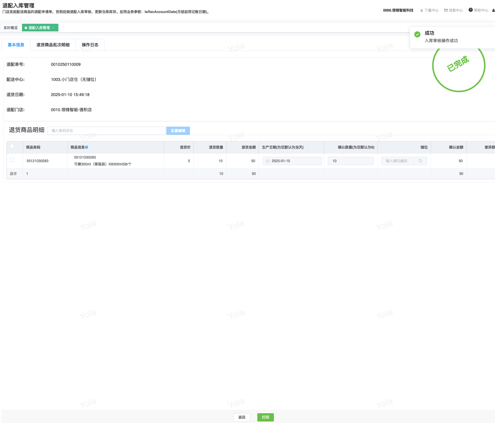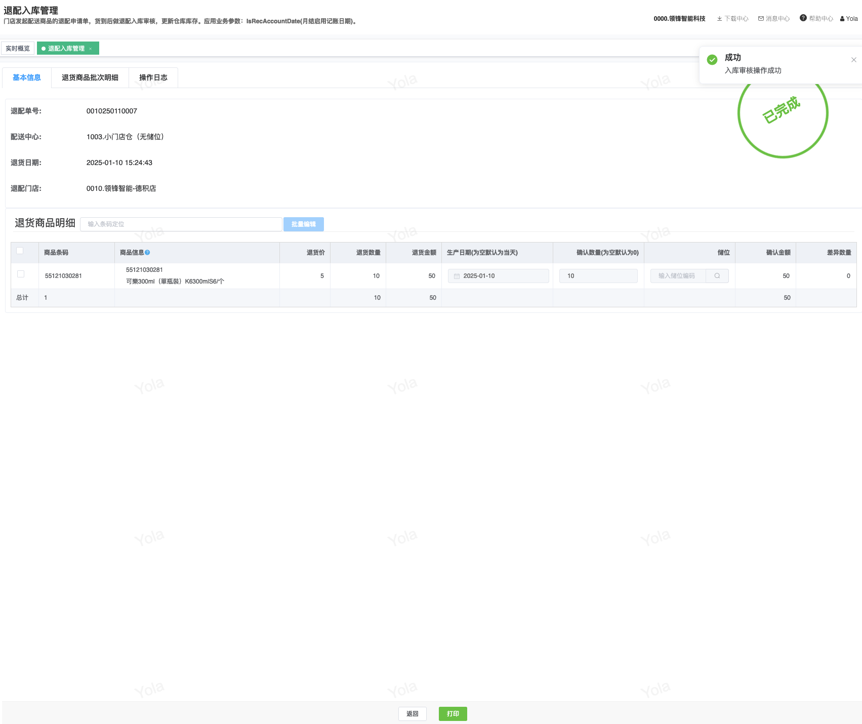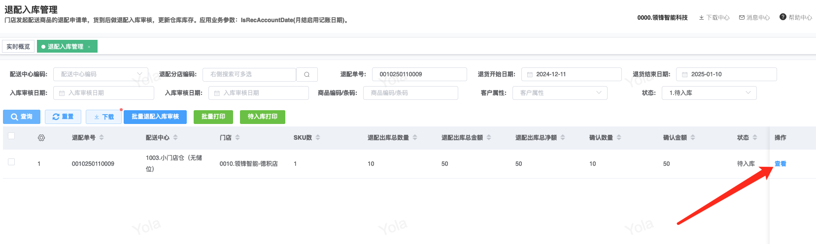 ## 通过参数控制退配流程,可设定门店扣减库存与自动出库审核业务节点 涉及模块:门店/采购/退配出库与总部/配送/退配入库 ### 系统参数:DCSendReturnType.退配出库扣库存类型和自动门店出库审核 【退配出库扣库存类型】:参数值1:=1时则一级审核时扣库存,其它为终极审核扣库存,如果一级审核扣库存则不允许回退;参数值2:=1则需总部退配审核,其它不需要。【入库审核后自动门店出库审核】:参数值3:0.不启用;1.启用,默认不启用。 ### 退配一级审核扣库存不允许回退,不需要总部审核,启用入库审核后自动门店出库审核(参数值1为1,参数值3为1)  * 业务说明:门店新增申请退配出库单,将锁定库存,门店审核后扣减库存;仓库总部登录,查询退配入库单审核后,门店退配出库单自动出库审核,门店退配完成。 * 业务流程: ```mindmap # 门店登录-退配出库 - 新增 - 选择【配送中心、退配类型】 - 【添加商品】选择退配商品 - 填写【退配数量】 - 确认 - 门店锁定库存 - 门店审核 - 门店扣减库存,释放锁定库存 # 总部登录-退配入库 - 查询 - 入库审核 - 仓库增加库存 ``` #### 1、退配前查询库存 * 模块路径:【门店登录】->【库存】->【商品库存查询】 * 查询门店库存  * 模块路径:【总部登录】->【库存】->【商品库存查询(配送)】 * 查询仓库库存  #### 2、新增退配单,确认保存锁定库存,门店审核扣减库存 * 模块路径:【门店登录】->【采购】->【退配出库】       * 模块路径:【门店登录】->【库存】->【商品库存查询】 确认保存退配单锁定库存  * 模块路径:【门店登录】->【库存】->【商品库存查询】 门店审核退配单扣减库存,释放锁定库存  #### 3、仓库审核退配单,入库审核,仓库增加库存 * 模块路径:【总部登录】->【配送】->【退配入库】 * 查询退配单,查看详情,入库审核,退配完成;    #### 4、退配完成查询库存 * 模块路径:【门店登录】->【库存】->【商品库存查询】 * 查询门店库存  * 模块路径:【总部登录】->【库存】->【商品库存查询(配送)】 * 查询仓库库存  ### 退配一级审核扣库存不允许回退,不启用入库审核后自动门店出库审核(参数值1为1,参数值3为0)  * 业务说明:门店新增申请退配出库单,将锁定库存,门店审核后扣减库存;仓库总部登录,查询退配入库单审核后,门店退配出库单不自动;门店查询退配出库单,出库审核后,门店退配完成。 * 业务流程: ```mindmap # 门店登录-退配出库 - 新增 - 选择【配送中心、退配类型】 - 【添加商品】选择退配商品 - 填写【退配数量】 - 确认 - 门店锁定库存 - 门店审核 - 门店扣减库存,释放锁定库存 # 总部登录-退配入库 - 查询 - 入库审核 - 仓库增加库存 # 门店登录-退配出库 - 查询 - 出库审核 ``` #### 1、退配前查询库存 * 模块路径:【门店登录】->【库存】->【商品库存查询】 * 查询门店库存  * 模块路径:【总部登录】->【库存】->【商品库存查询(配送)】 * 查询仓库库存  #### 2、新增退配单,确认保存锁定库存,门店审核扣减库存 * 模块路径:【门店登录】->【采购】->【退配出库】     * 模块路径:【门店登录】->【库存】->【商品库存查询】 门店保存退配单锁定库存  * 模块路径:【门店登录】->【库存】->【商品库存查询】 门店审核退配单扣减库存,释放锁定库存  #### 3、仓库审核退配单 * 模块路径:【总部登录】->【配送】->【退配入库】 * 查询退配单,查看详情,入库审核,仓库增加库存;    #### 4、仓库审核完成查询库存 * 模块路径:【门店登录】->【库存】->【商品库存查询】 * 查询门店库存  * 模块路径:【总部登录】->【库存】->【商品库存查询(配送)】 * 查询仓库库存  #### 5、门店出库审核退配单 * 模块路径:【门店登录】->【采购】->【退配出库】 * 查询退配单,查看详情,出库审核,退配完成。    #### 6、退配完成查询库存 * 模块路径:【门店登录】->【库存】->【商品库存查询】 * 查询门店库存  * 模块路径:【总部登录】->【配送】->【商品库存查询(配送)】 * 查询仓库库存  ### 退配一级审核不扣库存允许回退,不需要总部审核,启用入库审核后自动门店出库审核(参数值1为0,参数值3为1)  * 业务说明:门店新增申请退配出库单,将锁定库存,门店审核后不扣减库存;仓库总部登录,查询退配入库单审核后,门店退配出库单自动出库审核扣减库存,门店退配完成。 * 业务流程: ```mindmap # 门店登录-退配出库 - 新增 - 选择【配送中心、退配类型】 - 【添加商品】选择退配商品 - 填写【退配数量】 - 确认 - 门店锁定库存 - 门店审核 # 总部登录-退配入库 - 查询 - 入库审核 - 门店扣减库存,释放锁定库存 - 仓库增加库存 ``` #### 1、退配前查询库存 * 模块路径:【门店登录】->【库存】->【商品库存查询】 * 查询门店库存  * 模块路径:【总部登录】->【库存】->【商品库存查询(配送)】 * 查询仓库库存  #### 2、新增退配单,确认保存后锁定库存,无误后门店审核 * 模块路径:【门店登录】->【采购】->【退配出库】 * 新增退配单,确认保存;确认无误后门店审核;     * 模块路径:【门店登录】->【库存】->【商品库存查询】  #### 3、仓库审核退配单,仓库增加库存,门店扣减库存,释放锁定库存 * 模块路径:【总部登录】->【配送】->【退配入库】 * 查询退配单,查看详情,入库审核,仓库增加库存,门店扣减库存,释放锁定库存,退配完成;    * 模块路径:【门店登录】->【采购