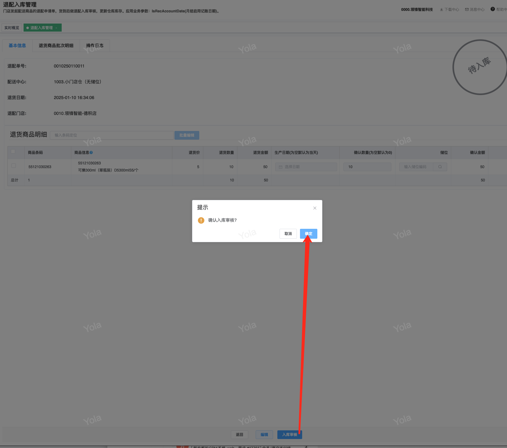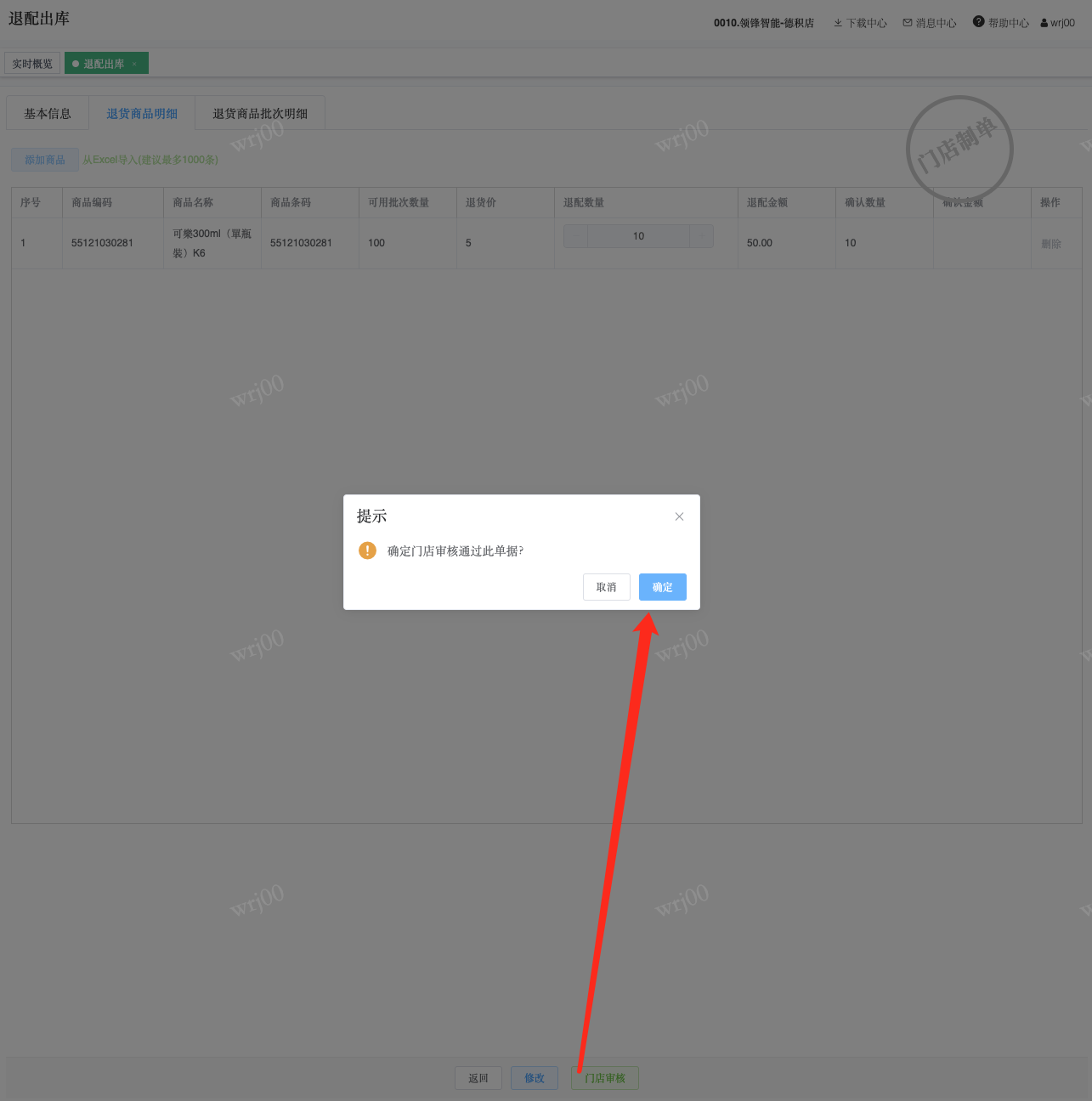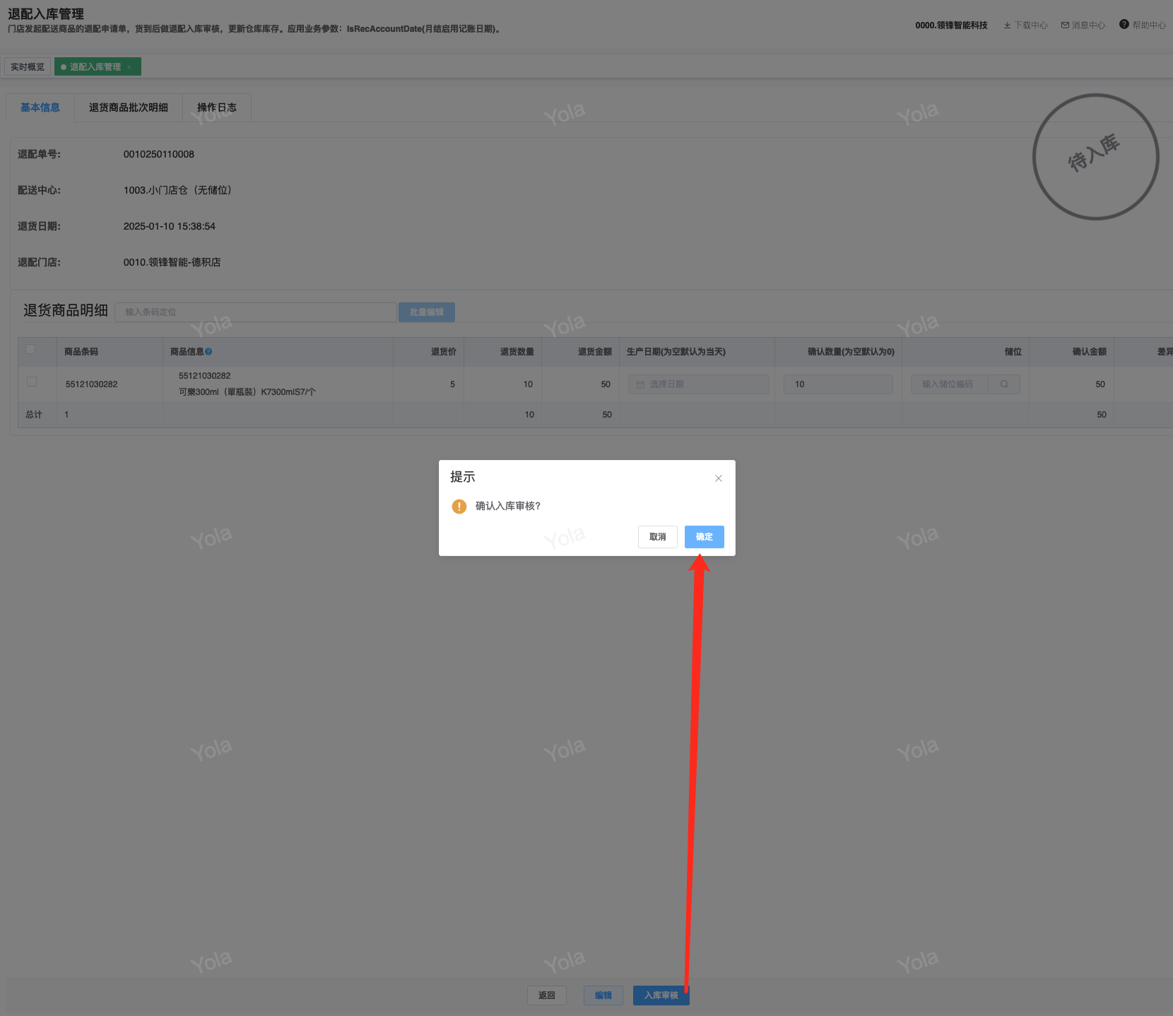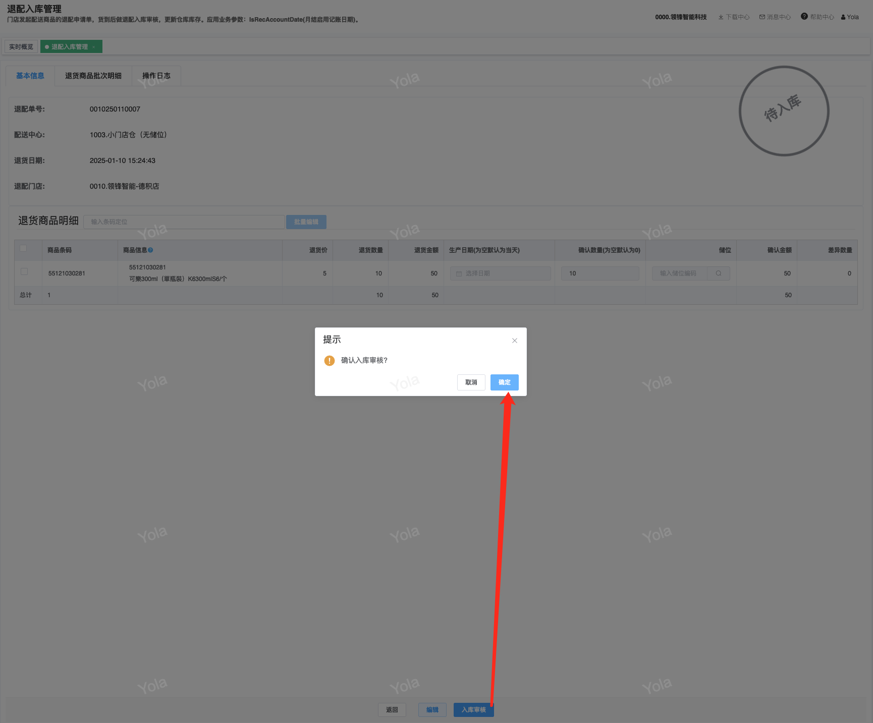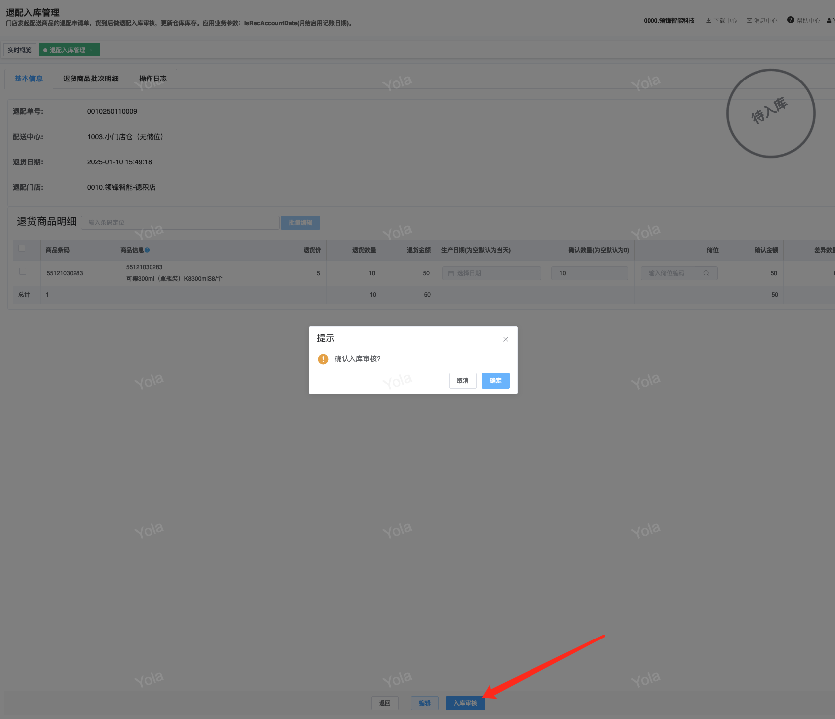 ## 通过参数控制退配流程,可设定门店扣减库存与自动出库审核业务节点 涉及模块:门店/采购/退配出库与总部/配送/退配入库 ### 系统参数:DCSendReturnType.退配出库扣库存类型和自动门店出库审核 【退配出库扣库存类型】:参数值1:=1时则一级审核时扣库存,其它为终极审核扣库存,如果一级审核扣库存则不允许回退;参数值2:=1则需总部退配审核,其它不需要。【入库审核后自动门店出库审核】:参数值3:0.不启用;1.启用,默认不启用。 ### 退配一级审核扣库存不允许回退,不需要总部审核,启用入库审核后自动门店出库审核(参数值1为1,参数值3为1)  * 业务说明:门店新增申请退配出库单,将锁定库存,门店审核后扣减库存;仓库总部登录,查询退配入库单审核后,门店退配出库单自动出库审核,门店退配完成。 * 业务流程: ```mindmap # 门店登录-退配出库 - 新增 - 选择【配送中心、退配类型】 - 【添加商品】选择退配商品 - 填写【退配数量】 - 确认 - 门店锁定库存 - 门店审核 - 门店扣减库存,释放锁定库存 # 总部登录-退配入库 - 查询 - 入库审核 - 仓库增加库存 ``` #### 1、退配前查询库存 * 模块路径:【门店登录】->【库存】->【商品库存查询】 * 查询门店库存  * 模块路径:【总部登录】->【库存】->【商品库存查询(配送)】 * 查询仓库库存  #### 2、新增退配单,确认保存锁定库存,门店审核扣减库存 * 模块路径:【门店登录】->【采购】->【退配出库】       * 模块路径:【门店登录】->【库存】->【商品库存查询】 确认保存退配单锁定库存  * 模块路径:【门店登录】->【库存】->【商品库存查询】 门店审核退配单扣减库存,释放锁定库存  #### 3、仓库审核退配单,入库审核,仓库增加库存 * 模块路径:【总部登录】->【配送】->【退配入库】 * 查询退配单,查看详情,入库审核,退配完成;    #### 4、退配完成查询库存 * 模块路径:【门店登录】->【库存】->【商品库存查询】 * 查询门店库存  * 模块路径:【总部登录】->【库存】->【商品库存查询(配送)】 * 查询仓库库存  ### 退配一级审核扣库存不允许回退,不启用入库审核后自动门店出库审核(参数值1为1,参数值3为0)  * 业务说明:门店新增申请退配出库单,将锁定库存,门店审核后扣减库存;仓库总部登录,查询退配入库单审核后,门店退配出库单不自动;门店查询退配出库单,出库审核后,门店退配完成。 * 业务流程: ```mindmap # 门店登录-退配出库 - 新增 - 选择【配送中心、退配类型】 - 【添加商品】选择退配商品 - 填写【退配数量】 - 确认 - 门店锁定库存 - 门店审核 - 门店扣减库存,释放锁定库存 # 总部登录-退配入库 - 查询 - 入库审核 - 仓库增加库存 # 门店登录-退配出库 - 查询 - 出库审核 ``` #### 1、退配前查询库存 * 模块路径:【门店登录】->【库存】->【商品库存查询】 * 查询门店库存  * 模块路径:【总部登录】->【库存】->【商品库存查询(配送)】 * 查询仓库库存  #### 2、新增退配单,确认保存锁定库存,门店审核扣减库存 * 模块路径:【门店登录】->【采购】->【退配出库】     * 模块路径:【门店登录】->【库存】->【商品库存查询】 门店保存退配单锁定库存  * 模块路径:【门店登录】->【库存】->【商品库存查询】 门店审核退配单扣减库存,释放锁定库存  #### 3、仓库审核退配单 * 模块路径:【总部登录】->【配送】->【退配入库】 * 查询退配单,查看详情,入库审核,仓库增加库存;    #### 4、仓库审核完成查询库存 * 模块路径:【门店登录】->【库存】->【商品库存查询】 * 查询门店库存  * 模块路径:【总部登录】->【库存】->【商品库存查询(配送)】 * 查询仓库库存  #### 5、门店出库审核退配单 * 模块路径:【门店登录】->【采购】->【退配出库】 * 查询退配单,查看详情,出库审核,退配完成。    #### 6、退配完成查询库存 * 模块路径:【门店登录】->【库存】->【商品库存查询】 * 查询门店库存  * 模块路径:【总部登录】->【配送】->【商品库存查询(配送)】 * 查询仓库库存  ### 退配一级审核不扣库存允许回退,不需要总部审核,启用入库审核后自动门店出库审核(参数值1为0,参数值3为1)  * 业务说明:门店新增申请退配出库单,将锁定库存,门店审核后不扣减库存;仓库总部登录,查询退配入库单审核后,门店退配出库单自动出库审核扣减库存,门店退配完成。 * 业务流程: ```mindmap # 门店登录-退配出库 - 新增 - 选择【配送中心、退配类型】 - 【添加商品】选择退配商品 - 填写【退配数量】 - 确认 - 门店锁定库存 - 门店审核 # 总部登录-退配入库 - 查询 - 入库审核 - 门店扣减库存,释放锁定库存 - 仓库增加库存 ``` #### 1、退配前查询库存 * 模块路径:【门店登录】->【库存】->【商品库存查询】 * 查询门店库存  * 模块路径:【总部登录】->【库存】->【商品库存查询(配送)】 * 查询仓库库存  #### 2、新增退配单,确认保存后锁定库存,无误后门店审核 * 模块路径:【门店登录】->【采购】->【退配出库】 * 新增退配单,确认保存;确认无误后门店审核;     * 模块路径:【门店登录】->【库存】->【商品库存查询】  #### 3、仓库审核退配单,仓库增加库存,门店扣减库存,释放锁定库存 * 模块路径:【总部登录】->【配送】->【退配入库】 * 查询退配单,查看详情,入库审核,仓库增加库存,门店扣减库存,释放锁定库存,退配完成;    * 模块路径:【门店登录】->【采购