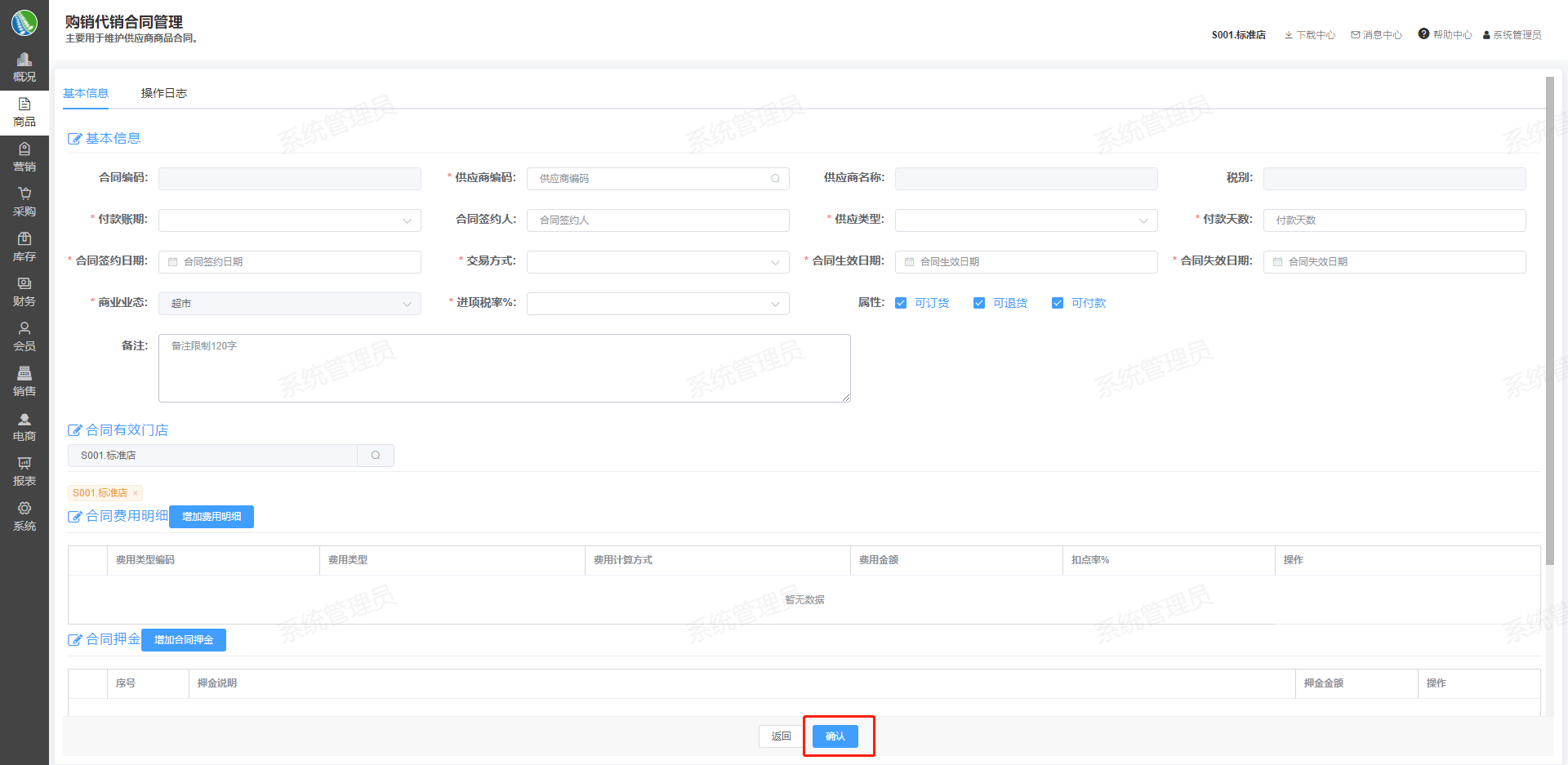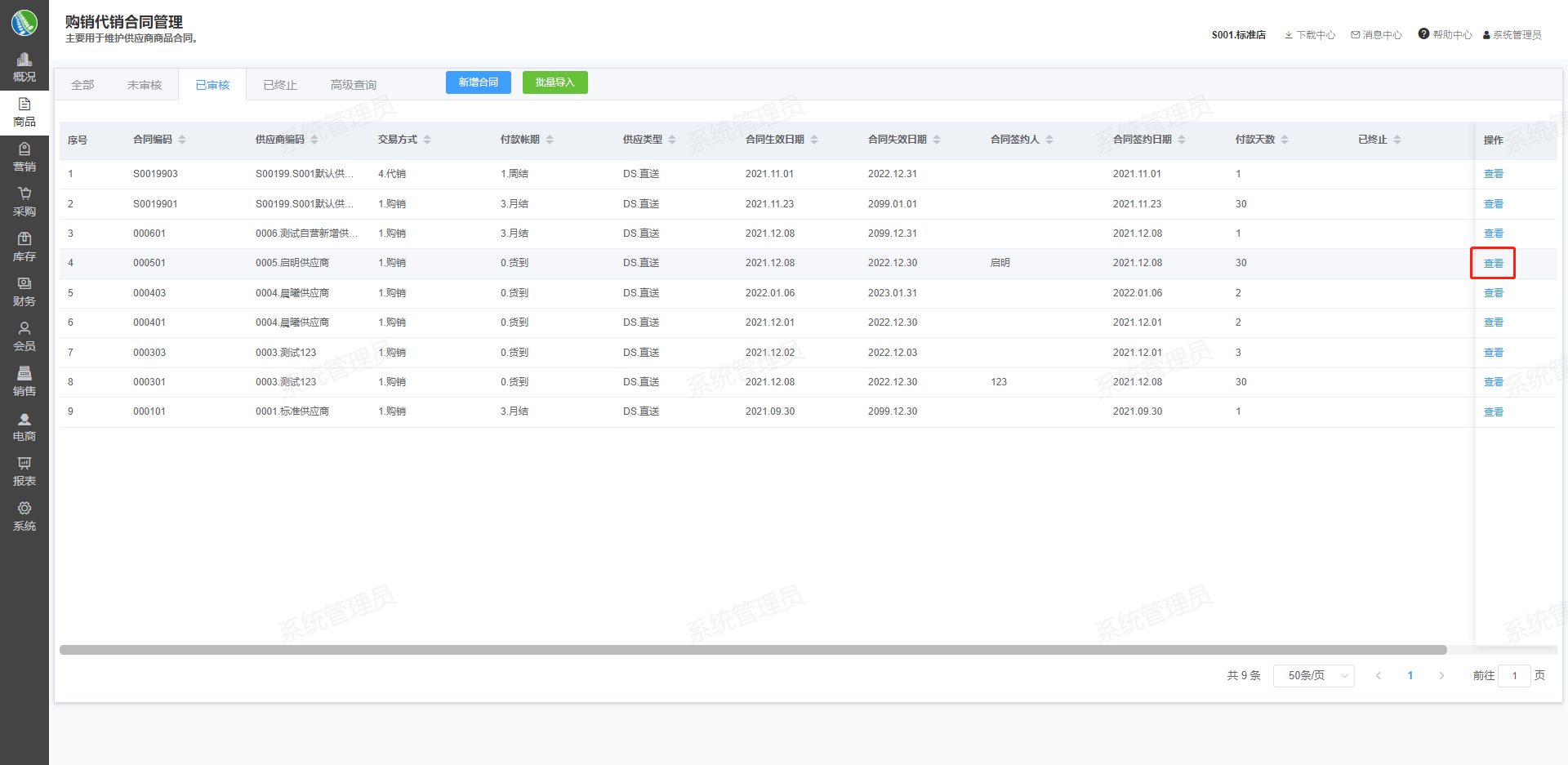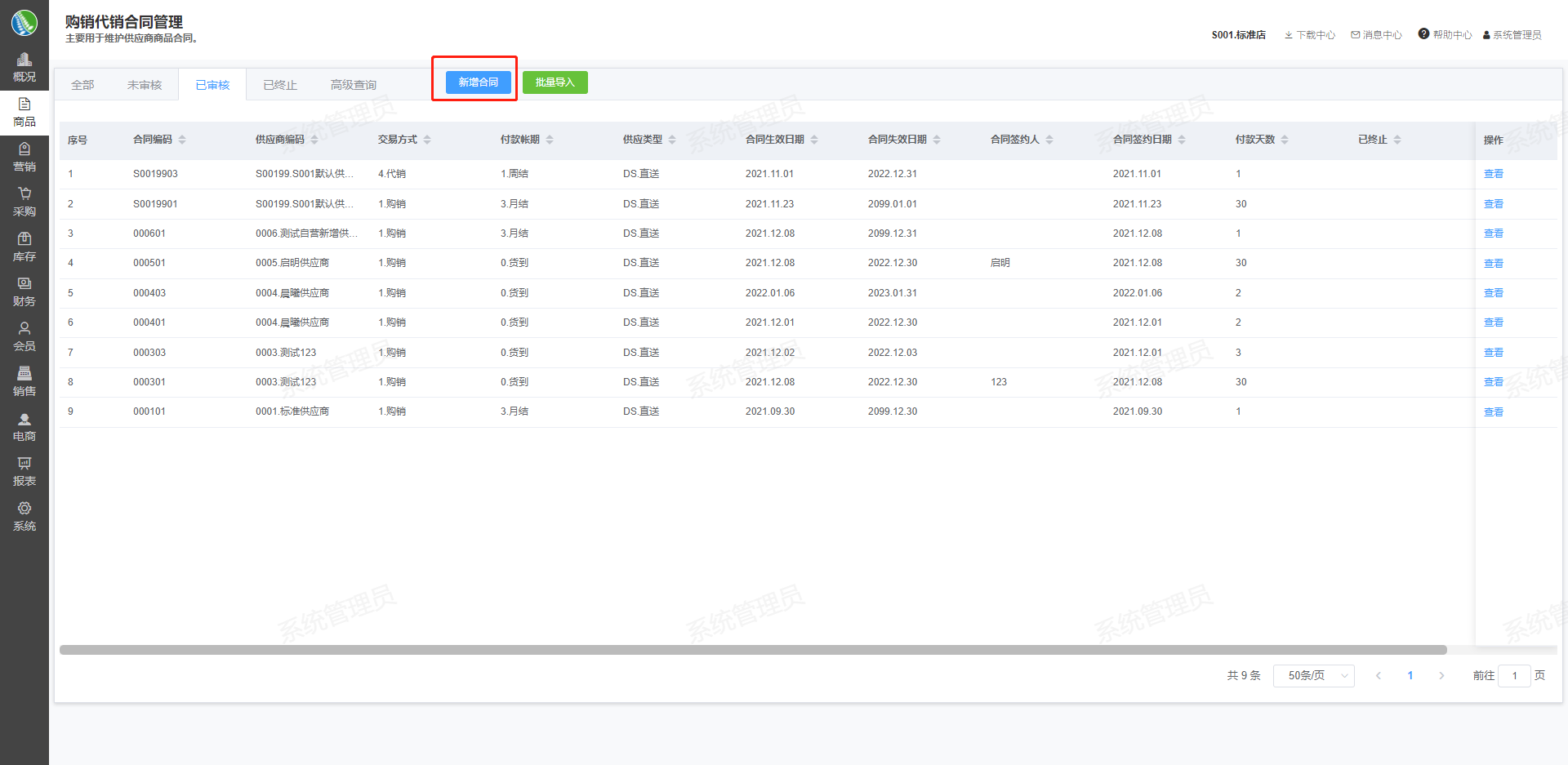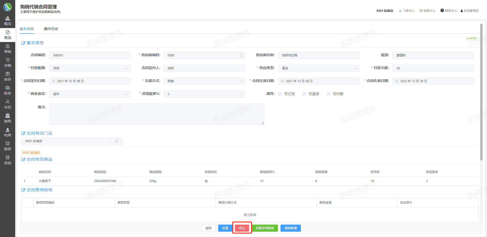 ## 一、案例说明 主要用于维护供应商商品合同。 ## 二、使用场景 ### 创建购销合同 1.进入模块路径:新零售门店运营系统后台-商品-购销代销合同管理 2.点击新增合同,填写购销合同资料 3.点击确认按钮,新增购销合同   ### 变更购销合同 1.进入模块路径:新零售门店运营系统后台-商品-购销代销合同管理 2.选择要变更的购销合同,点击查看按钮,进入购销合同详情页 3.点击变更按钮,变更购销合同信息 4.点击确定按钮,保存变更信息    ### 终止购销合同 1.进入模块路径:新零售门店运营系统后台-商品-购销代销合同管理 2.选择要终止的购销合同,点击查看按钮,进入购销合同详情页 3.点击终止按钮,终止此购销合同