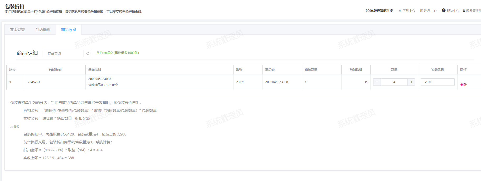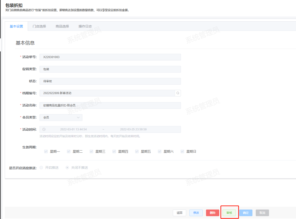 [营销活动](https://help.linkfern.com/project-11/doc-278/ "营销活动") / ## 一、活动案例 活动主题:软糖商品批量折扣-限会员 活动内容:活动期间店内消费,购买指定数量活动商品,可在指定时间段享受折扣 活动时间:3.1~3.25 ## 二、活动设置步骤 设置包装折扣,如设置软糖商品限时批量折扣,购买指定商品指定数量参与 1.进入模块路径:新零售门店运营系统后台-营销-包装折扣 2.设置基本信息,档期、会员类型、活动时间、活动名称  3.选择门店  4.选择商品,设置满足数量和总价,确认信息保存  5.审核活动  ## 三、活动使用场景 顾客到门店交易,购满指定数量活动商品,按折扣总价销售 1.登录POS,开单交易,购买活动商品   2.付款显示折扣价   ## 四、活动结果(相关报表,数据截图) 1.进入模块路径:新零售门店运营系统后台-报表-收银报表查询-收银小票销售明细查询