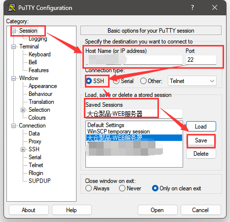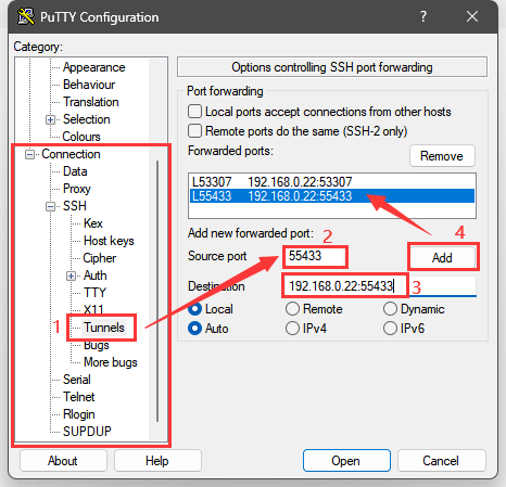 # 如何使用Putty端口转发连接远程数据库 ## 1.配置隧道IP端口 - 首先选中【Session】,在Host Name(or IP address)处,输入远程服务器IP地址和端口号,在Connection type处,选择SSH,在Saved Seesions处,输入要保存的名称,然后点击【保存】,详细配置操作请见下图:  ## 2.设置登陆用户名 - 选中【Connection】->【Data】,在Auto-login username处输入登录用户名,详情请见下图:  ## 3.设置隧道密码文件 - 选中【Connection】->【SSH】->【Auth】->【Credentials】,在Private key file for authentication处,选择私钥文件,详情请见下图:  ## 4.设置要跳转的数据库及映射端口 - 在【Connection】->【SSH】->【Tunnels】,在Add new florwarded port处,输入以下内容: `Source port(本地访问端口)、Destination(远程内网服务器地址和端口号,服务器地址和端口中间用冒号隔开)` - 配置SQL Server实例: ``` Source port(本地访问端口):55433 Destination(远程内网服务器地址和端口号):内网IP地址:55433 ``` 详情请见下图:  ## 5. 保存Putty设置,打开隧道机  - 点击【Open】后,自动登录远程服务器  - 用tcping或telnet工具测试连接本地IP地址127.0.0.1,指定端口是否通  ## 6. SQL SERVER 连接测试 - 使用SQL Server Management Studio工具,在【服务器名称】文本框中,输入:127.0.0.1,55433  - 点击【连接】,连接成功如下图:  - 连接成功后可以查看数据库配置
