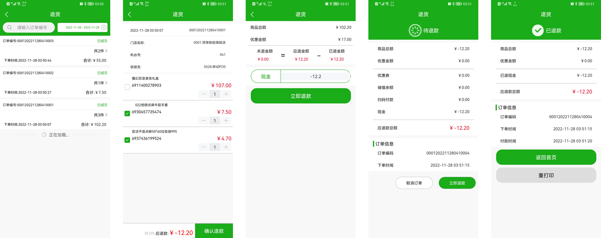 ### 功能说明 对当前门店的订单进行退货,支持部分商品退货 (执行无权限的操作自动弹出授权) ### 操作流程 1、进入【退货】页 2、找到需要退货的订单,点击进入退货详情 3、勾选需要退货的商品及对应数量 4、点击【确认退款】 5、根据原销售支付方式进行退款