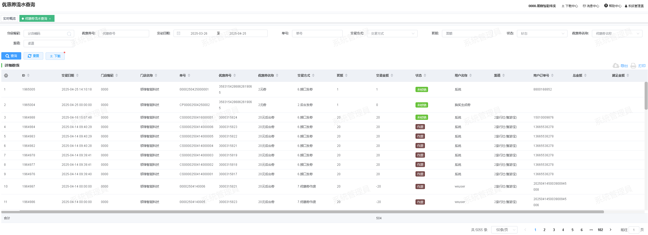 ### 功能说明 ### 操作路径 【报表】→【优惠券报表】→【优惠券流水查询】 ### 操作界面  ### 按钮说明 * 查询:选择好查询条件后,查询所需要的数据 * 重置:查询条件恢复到默认值 * 下载:根据选择的查询条件,将数据下载任务推送到异步下载队列中,待任务拉取数据完成后可在下载中心下载文件